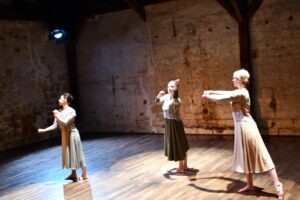 Une impression poignante, presque un pathos, imprègne certaines de ces strophes (le public est laissé libre d’imaginer que les trois danseuses sont des mères) et ces corps dansants l’incarnent à merveille, avec l’orchestration claire souvent éclatante et martiale d’Eisler contrastant avec son piano triste et les paroles de Brecht qui claquent, épousant plusieurs registres. Précisons que cet extrait dure moins de dix minutes alors que la pièce entière en dure trente-cinq, avec présence de danseurs masculins et musiques de Mahler et Ligeti. Les danseuses, Stéphanie Coutelle, Manon et Louise Marazano, ont toutes trois été formées par Marie Devillers et sont très convaincantes dans ce moment rare et dansé comme « hors du temps »… Faut-il ajouter qu’on aurait envie aujourd’hui de revoir la pièce dans son intégralité ?