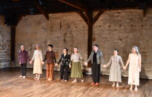 Des bras plongent vers le sol, des oppositions se font entre bassin et haut du corps, des chutes douces vers le bas ont lieu, des poings martèlent les cuisses, les bras s’entrelacent pour un moment de chœur vocal doublant la musique enregistrée sur la bande-son, celle-ci se terminant par le bruit d’un train à vapeur démarrant, comme au moment du départ sur le quai d’une gare. Si l’on saisit le sens des paroles (non traduites dans la feuille de salle), on est immergé dans un passé allemand vieux de près d’un siècle, fait de militantisme communiste et antimilitariste, de solidarité de gauche, d’évocations des privations de mères laborieuses s’adressant à leurs fils et souffrant de la faim, du froid et de fin de mois difficiles.