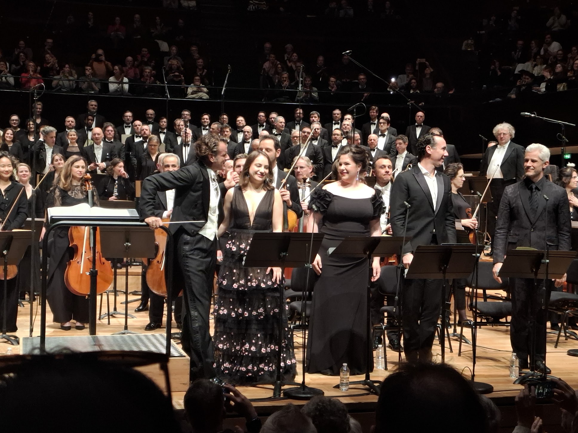 La dimension orchestrale de l’œuvre frappe dès les premières mesures. La puissance des accords, la majesté de cette musique sont envoûtantes. La tragédie est là, mais elle va être éclairée par le magnifique solo de la soprano. L’orchestre revient en force lorsqu’ éclate brutalement le Dies Irae. La colère divine est manifeste. Lors du Tuba Mirum l’auditeur sera touché par le solo de trombone, repris par la somptueuse voix de basse de Christian Immler. Il est rejoint par le ténor Éric Ferring et l’alto Eva Zaïcik. La douceur, la suavité de la voix du ténor, la chaleur de celle de l’alto nous conduisent vers la sérénité. Les quatre solistes chantent en pleine lumière du haut de la muraille le Recordare. Sublime mélodie, dont il émane une douceur et une tendresse très émouvantes. Après quelques bribes lointaines comme égarées de la musique de Mozart, place au Lacrimosa. Un moment de toute beauté, mais fugace, car nous n’entendrons que les huit premières mesures, les seules écrites par Mozart. Requiem aeternam: le spectacle se termine par une reprise de l’Introitus tous les danseurs et chanteurs sont réunis en rond au centre de la scène. L’auditeur sera emporté par ce moment solennel, par la grandeur de cette musique et pourra entendre à nouveau la voix pure et limpide de la soprano Hélène Carpentier.