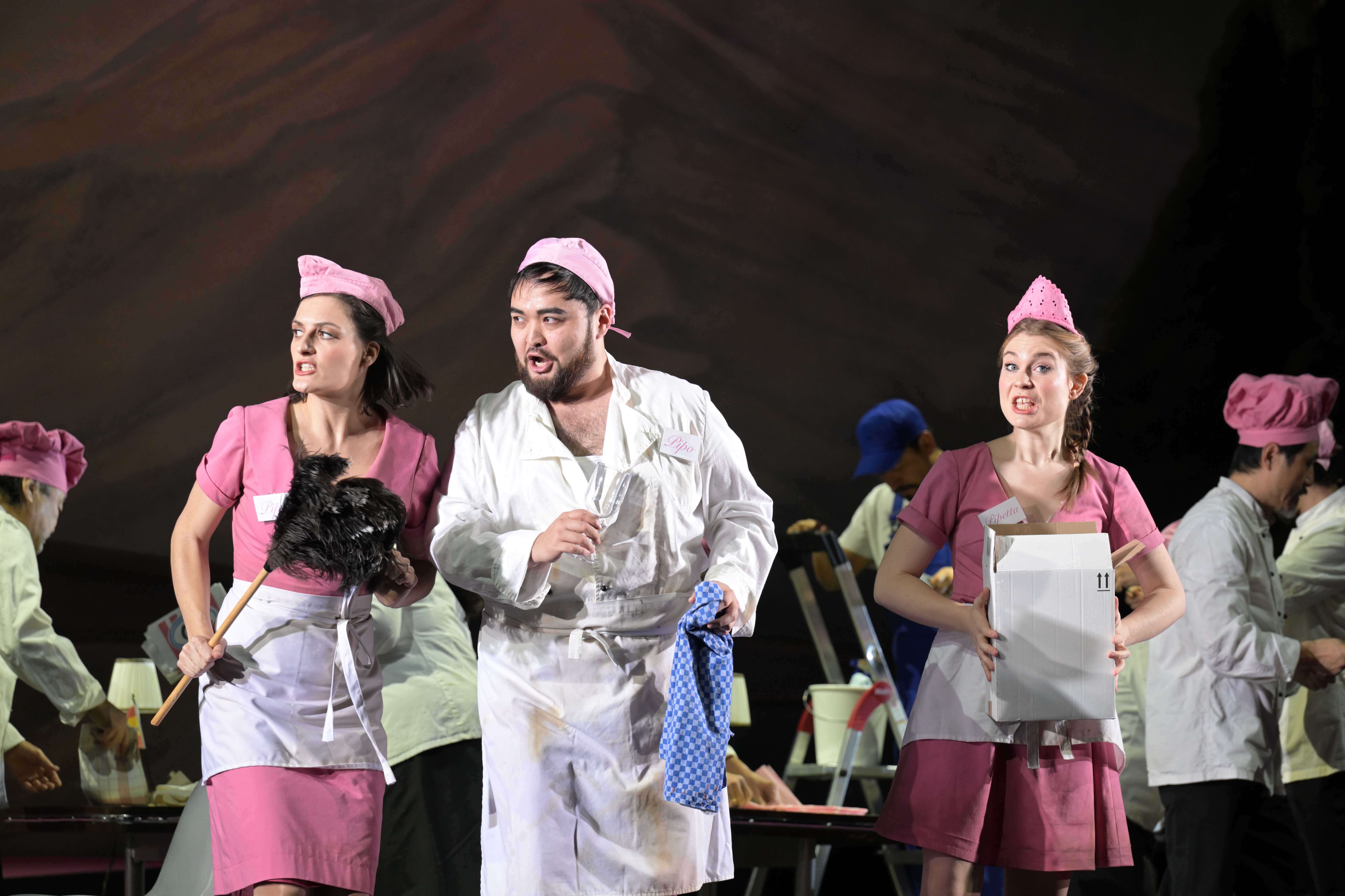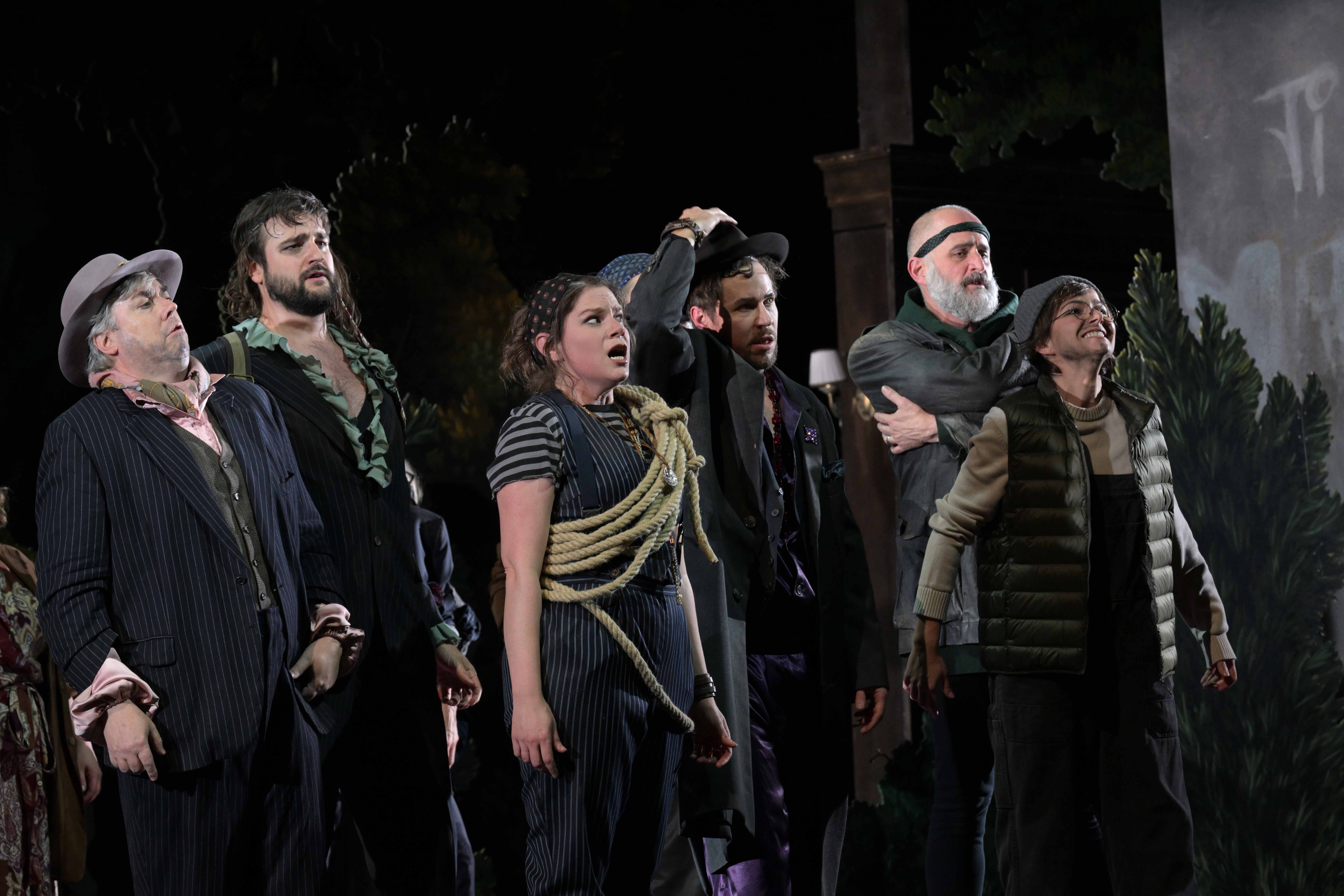 Les bandits sont menés par le ténor Gerhard Schneider qui, dans le rôle du capitaine Falsacappa, conduit sa bande avec panache. La voix est riche et belle, le chanteur excellent acteur, les airs sont enlevés tout en étant parfaitement naturels, dans le style qui sied à l’opérette, le discours parlé est particulièrement drôle et vif. Dans le rôle de sa fille Fiorella, la soprano Elizabeth Reiter campe une jeune femme vive, audacieuse, enjouée, particulièrement sympathique et ne ménageant jamais sa peine pour courir d’un bout du plateau à l’autre dans divers costumes dont la plaisante salopette de l’acte 1. Le rôle le plus surprenant est sans doute celui de Fragolito, rôle de travesti joué et chanté brillamment par la mezzo-soprano Kelsey Lauritano, devenue dans la mise en scène un fermier bio aux allures de garçon manqué doté d’un humour redoutable et d’un charme égal à celui de la belle Fiorella.