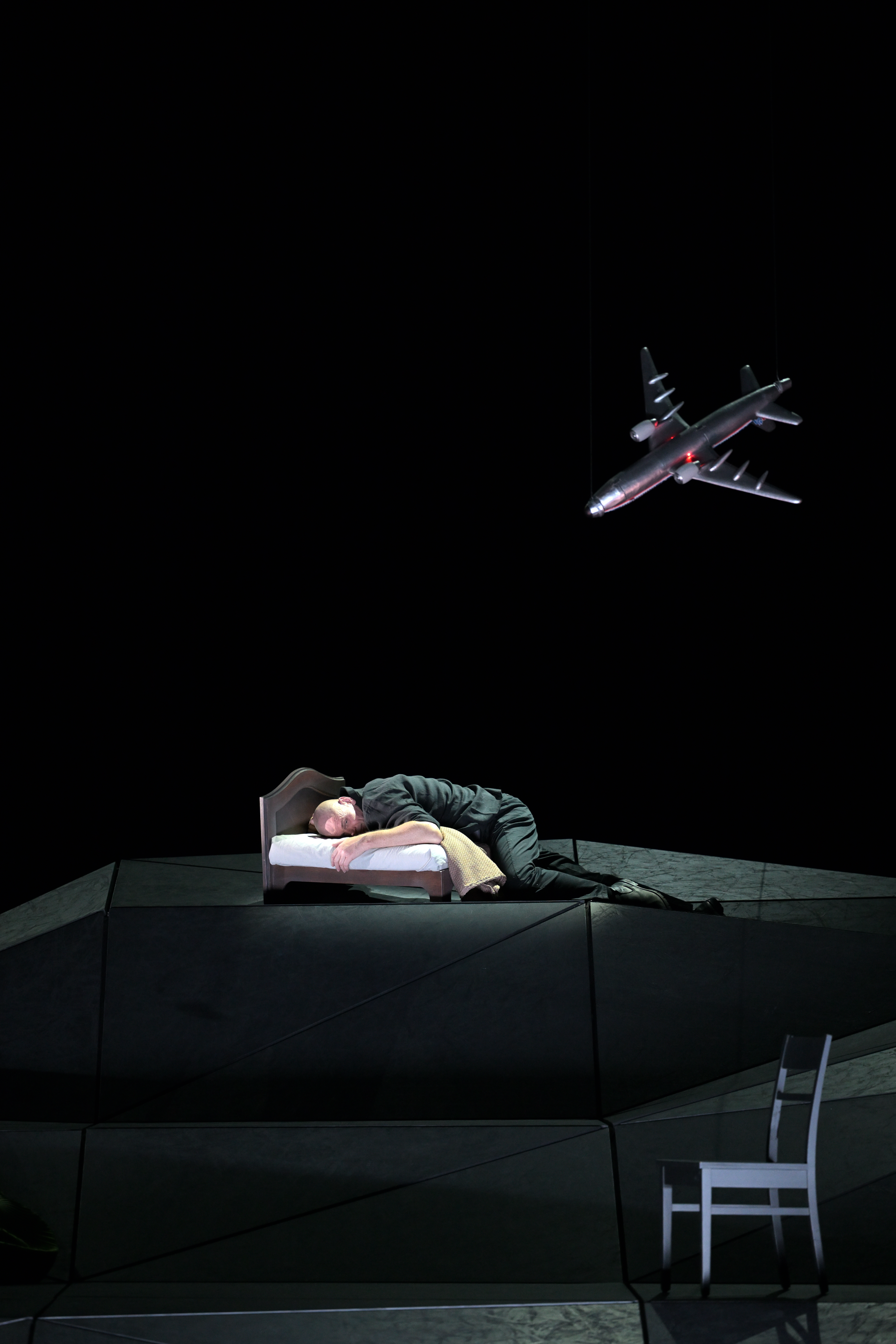 Un jeu de lumière permet de passer du jour à la nuit tandis qu’au fil des tableaux, surgissent dans le ciel, tantôt un avion de ligne en descente et plus tard les troncs de sept bouleaux dont on ne voit pas les branches.