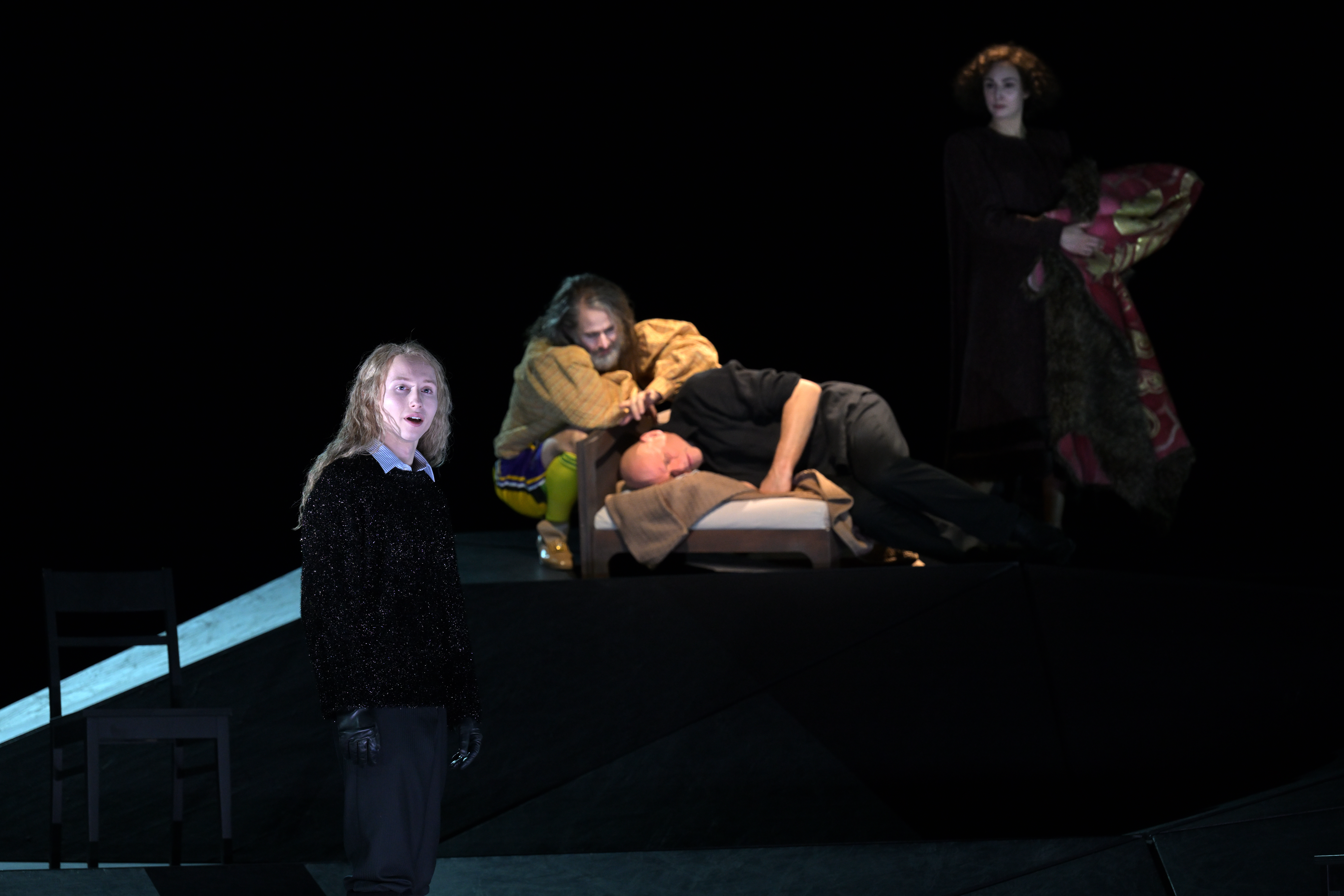 Le « Boy » (et « premier ange ») du contre-ténor Iurii Iushkevich, a l’allure asexuée d’un être venu d’ailleurs, plus céleste que charnel, qui sert de miroir aux deux personnages principaux, avec ses reflets d’où jaillit l’art. Blond, cheveux longs, allure gracile et élégance naturelle, le contre-ténor symbolise parfaitement cet ange qui sera, tel l’agneau, sacrifié sur l’autel des désirs et des dépravations humaines. L’on admire son aisance scénique comme sa voix presque indéfinissable qui donne tant de poésie à l’ensemble de la représentation.