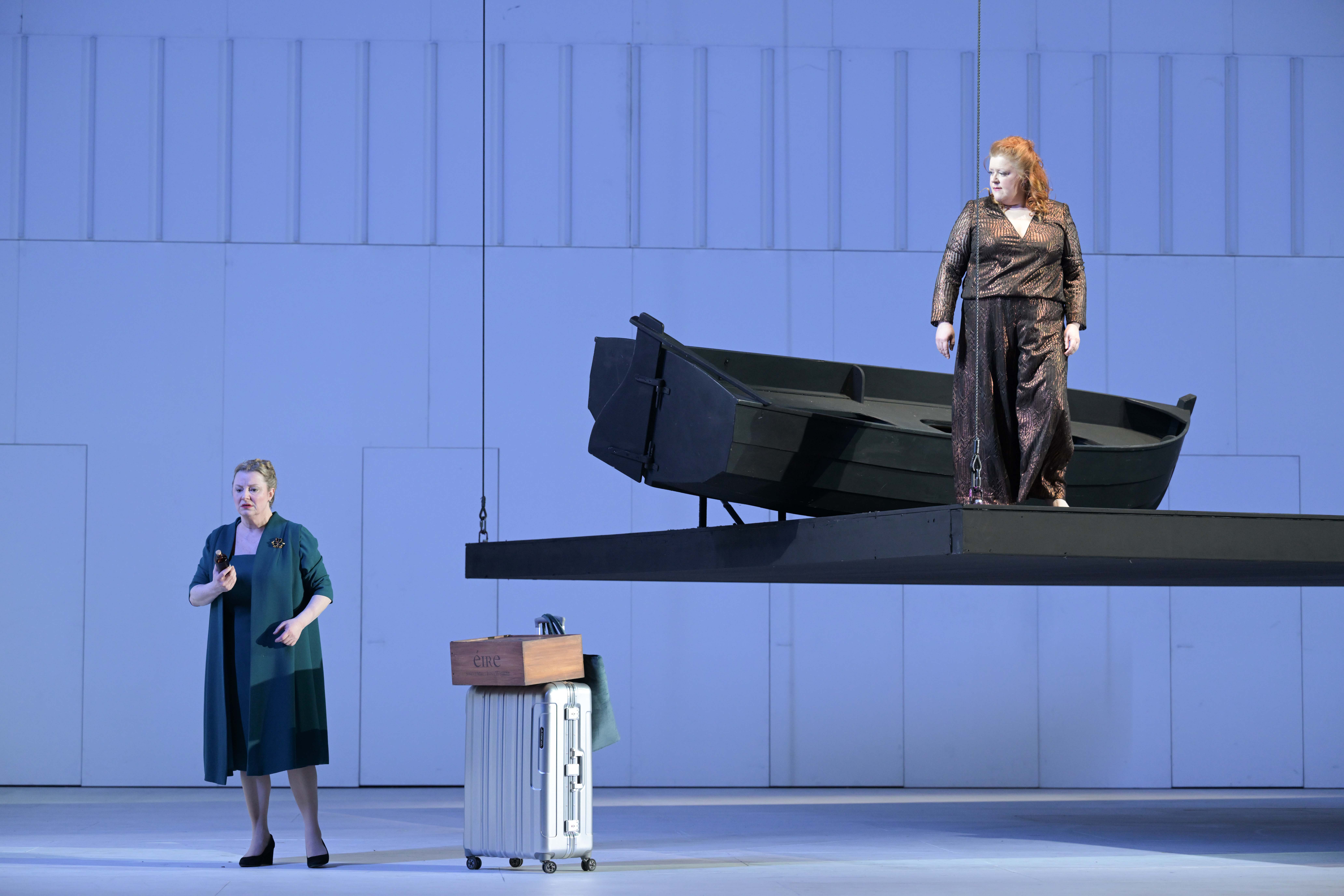 Simples et dépouillés les décors de Johannes Leiacker subtilement rehaussés par le jeu d’éclairage de Olaf Winter, ont pour thème commune, le bateau, un petit canot qui change de couleurs et parait tantôt flotter sur l’eau (acte 1), tantôt s’être échoué au milieu d’un environnement âpre et hostile (acte 3). A ce premier accessoire récurrent, s’ajoute un long module rectangulaire qui n’est pas sans évoquer le mystérieux monolithe noir de « 2001 l’odyssée de l’espace », mythique film de Stanley Kubrik.