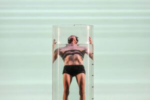 L’artiste court, s’essouffle, agonise dans cette capsule qui prend l’eau. Il nous observe à peine, mais interroge le langage, se demande « qui parle ? ». D’où proviennent ces mots et ce corps qui apparaissent comme une tache dans ce décor épuré ? On ne comprend pas vraiment ce que nous raconte Olivier de Sagazan, pourtant cela fonctionne. On suit la lente montée des eaux pendant qu’il déploie un discours bien souvent inaudible, dont on arrive à saisir quelques bribes seulement. Il crie, se tord, a des tocs, s’étouffe dans la paroi serrée du tube d’expérimentation. Le corps de l’artiste est semblable à celui d’un rat de laboratoire autour de ces deux scientifiques du son et de l’image… Pour un spectateur qui n’est pas accoutumé à la saturation musicale, cela surprend, répulse, mais fascine: jusqu’où la performance d’Olivier de Sagazan va-t-elle aller ?