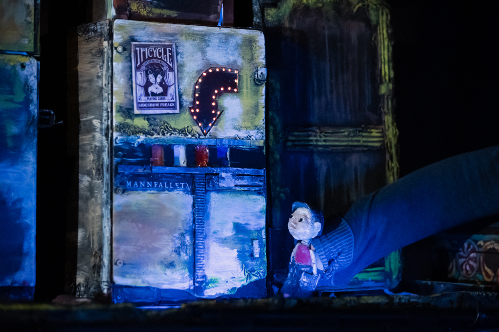 Les marionnettes à doigts et à tige semblent sorties d’un autre monde et renvoient une sensation de douce tristesse. Une des marionnettes représente l’homme, elle rejoue son passé en traversant les boîtes. Elle saute d’immeuble en immeuble, elle est vivante et attachante. Le marionnettiste manipule habilement son petit corps et s’efface pour lui donner vie.