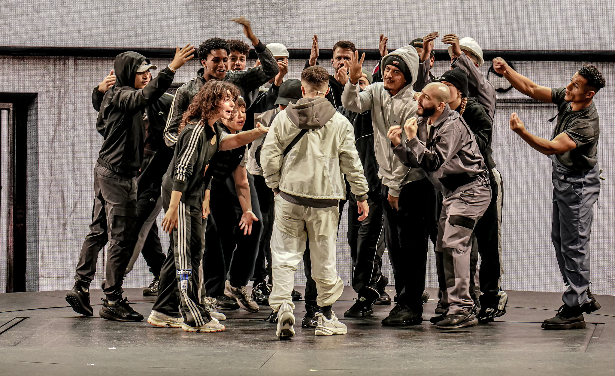 La mise en scène interroge parfois sur le budget alloué pour la conception d’un tel projet. Sans la vidéo, les décors sont pauvres, pour ne pas dire inexistants. On n’est pas moins emporté par le projet grâce à l’ingéniosité des dispositifs qui reproduisent brillamment la déambulation du film sur scène. La qualité des chorégraphies aux accents très hip-hop de Emilie Capel et Yaman Okur est aussi à souligner. La quinzaine de danseureuses occupent et fait vivre l’espace, imagent les scènes de bastons et de manifestations, autant qu’iels illustrent les raps, « La Haine d’un frère » et « La Haine d’un flic » écrits par Youssoupha et interprétés dans les deux cas par Walid Afkir avec une justesse criante.