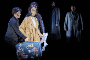 Sans prétendre plaire à tous, la mise en scène de Grégory Voillemet a de quoi marquer les esprits… Car les 7 chanteureuses ne sont pas seul.e.s sur scène et interagissent avec les marionnettes de Amélie Madeline. Les pantins se meuvent avec une étonnante facilité, maniés avec dextérité par les marionnettistes tout de noir vêtu, que l’on oublierait. L’aisance maladroite des poupées quasi grandeur nature laisserait presque soupçonner une once de vie, mais le regard vide et les visages grotesques n’ont d’humain que les traits. Tandis que les spectateurices sont happé.e.s par cet expressionnisme silencieux, les chanteureuses déclament leur texte, légèrement en retrait.