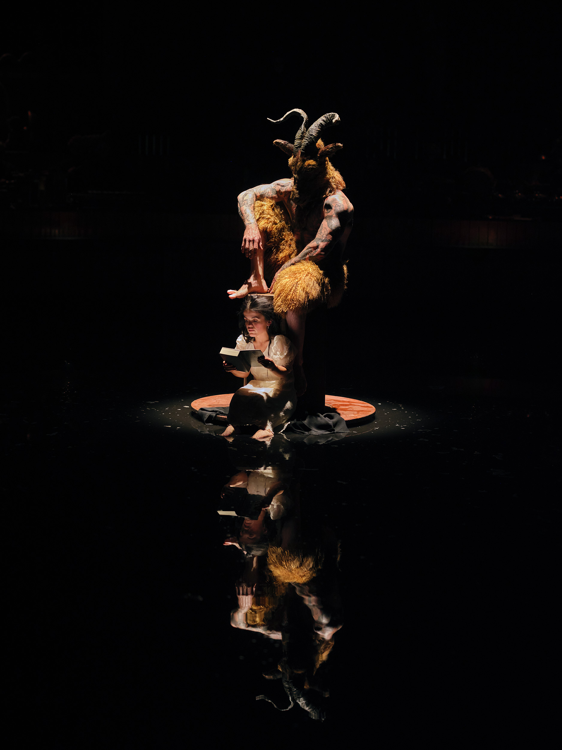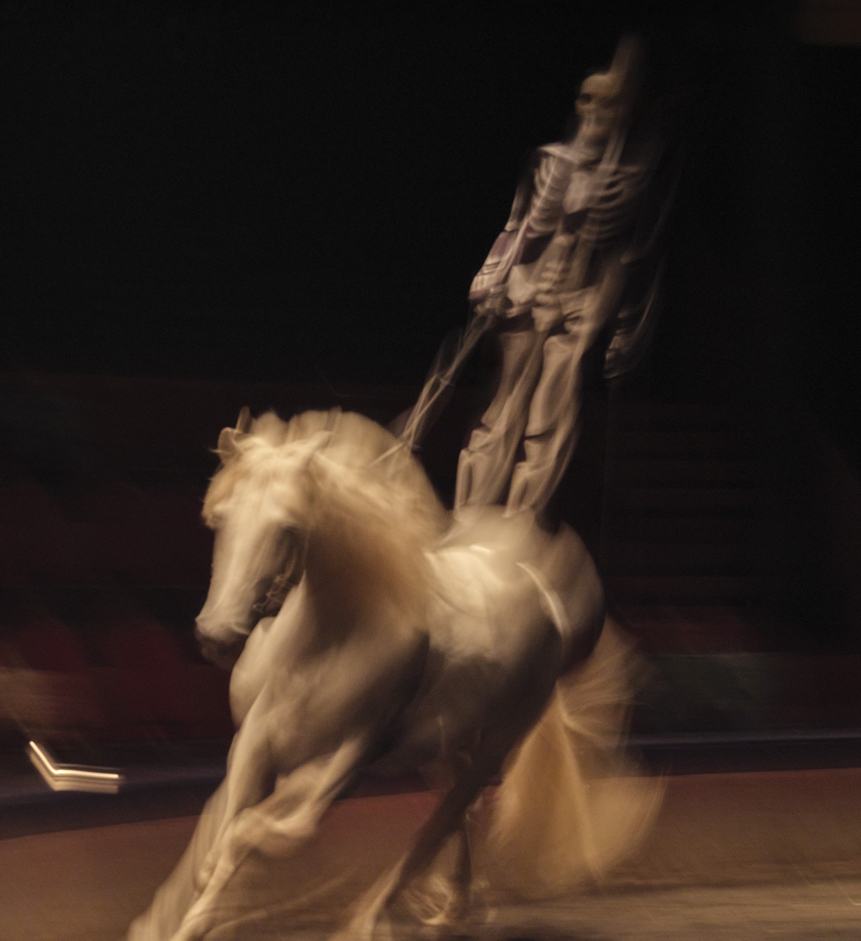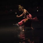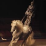 Ici, c’est le texte initial qui relève de l’imaginaire et le spectacle qui se concentre. Une inversion des rythmes dans laquelle on retrouve la touche d’humour qu’on aime tant à Zingaro comme avec les squelettes de médecine qui montent à cheval. Était également présente l’eau au centre de la carrière, qui avait très bien marché dans Femmes persanes en apportant un lyrisme particulier à l’ensemble. Les jeux de reflets dans l’eau apportent une poésie douce. Dans sa radicalité, Les Cantiques du Corbeau ressemblent à une lecture scénographiée et peuvent ralentir le rythme d’un spectacle qu’on pense davantage équestre.