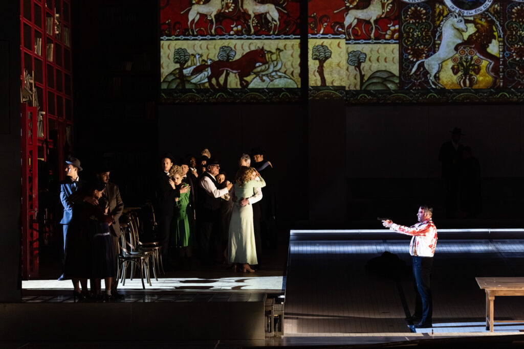 C’est peu dire que le chef, l’actuel directeur musical de l’Opéra de Francfort, Thomas Guggeis fait exploser Strauss et que le torrent musical, lorsqu’il parvient à le libérer, occupe tout l’espace et fusionne, dans sa splendeur, avec le décor de Szczesniak. Lors de la danse de Salomé, le chef nous submerge dans un torrent sonore dans la salle de l’opéra avec sa sublime acoustique.