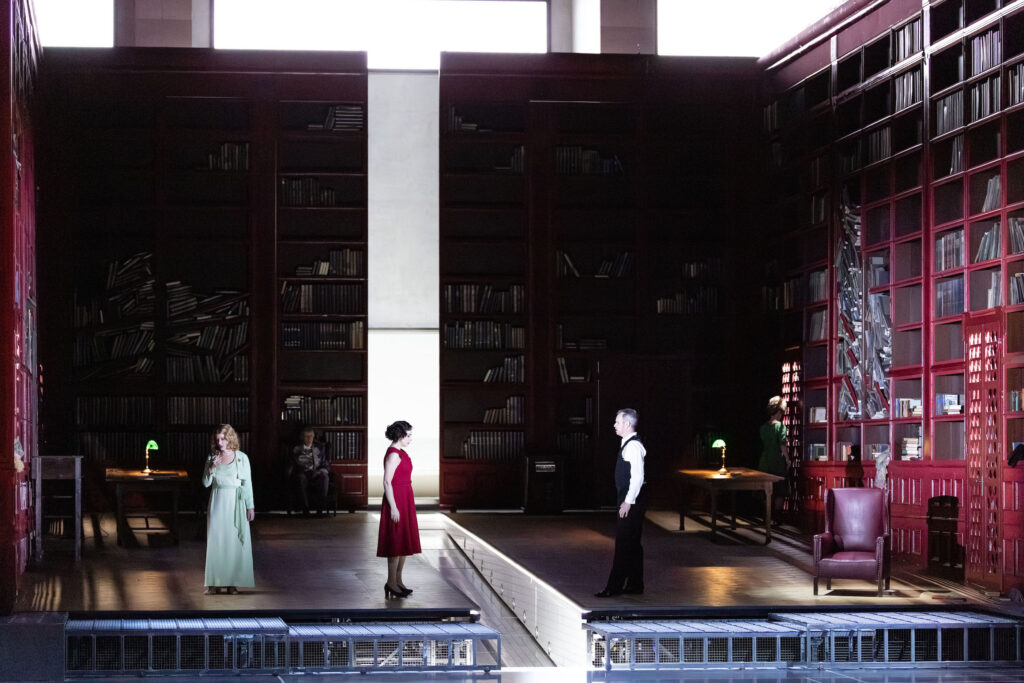 Largués à aucun moment pourtant, on ne décroche tant le spectacle en CinémaScope est à couper le souffle. Malgorzata Szczesniak, l’immense décoratrice de Warlikowski, s’est encore surpassée. La grande scène du théâtre bavarois est totalement occupée par cette bibliothèque, qui s’ouvre par moments, en son milieu, pour laisser place à une gigantesque piscine, lieu où Salomé descend lorsqu’elle est aux prises avec ses fantasmes et Jochanaan, notamment pour une danse des sept voiles, sensuelle et provocante, transformée en ballet de noces funèbres.