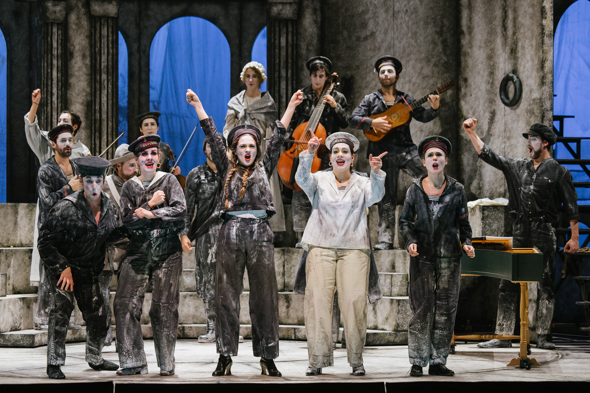 Jean-Luc Choplin est donc tombé sur ce projet assez fou de Goethe : donner une suite au dernier opéra de Mozart. S’il fallait être suédois pour filmer la flûte, il fallait probablement être anglais pour composer la suite et c’est à Damon Albarn (avec qui il avait fait notamment Monkey Journey to the West au Châtelet, il y a 20 ans) que le directeur du Lido2Paris a passé la commande. Au livret, l’on trouve le dramaturge britannique Jeremy Sams, fidèle à Goethe, donc. Et l’on est réellement heureux de retrouver les personnages de la Flûte : la Reine de la nuit (incarnée par le contre-ténor Christopher Robson, haut perché sur ses chaussures de star) maudit à nouveau sa fille (décidément, elle lui en veut !), Pamina (Elizabeth Karani), et son mari Tamino (superbe timbre d’Alfred Mitchell) et les condamne à être séparé.es de leur enfants. La malédiction rythme donc ce sequel, tandis que Zarastro (Richard Burkhard) continue à souffler une sagesse ancestrale et un peu sombre, tandis que Papageno (Hugo Herman-Wilson) et Papagena (Anna Gregg) en ont assez de manger, dormir, faire l’amour et être heureux : ils préfèrent donner naissance à une batterie de petits-enfants…