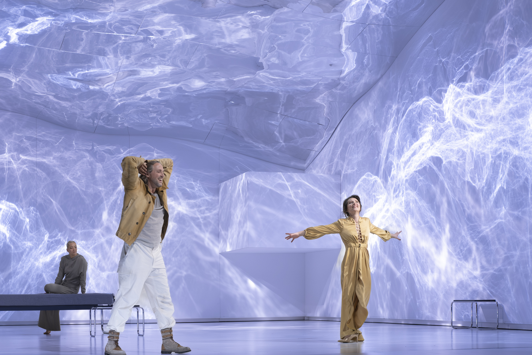 Car à tout moment, avec Stefano Poda, c’est du spectacle en grand large. Le premier tableau est en noir et blanc (sans que l’on comprenne réellement la signification de ces couleurs) puis, durant toute la soirée, ces couleurs se renouvelleront tant pour les costumes que pour les lasers ; de nombreux figurants occupent la scène ou les gradins en arrière-plan et effectuent une chorégraphie parfois étrange (et pas toujours très bien réglée).
