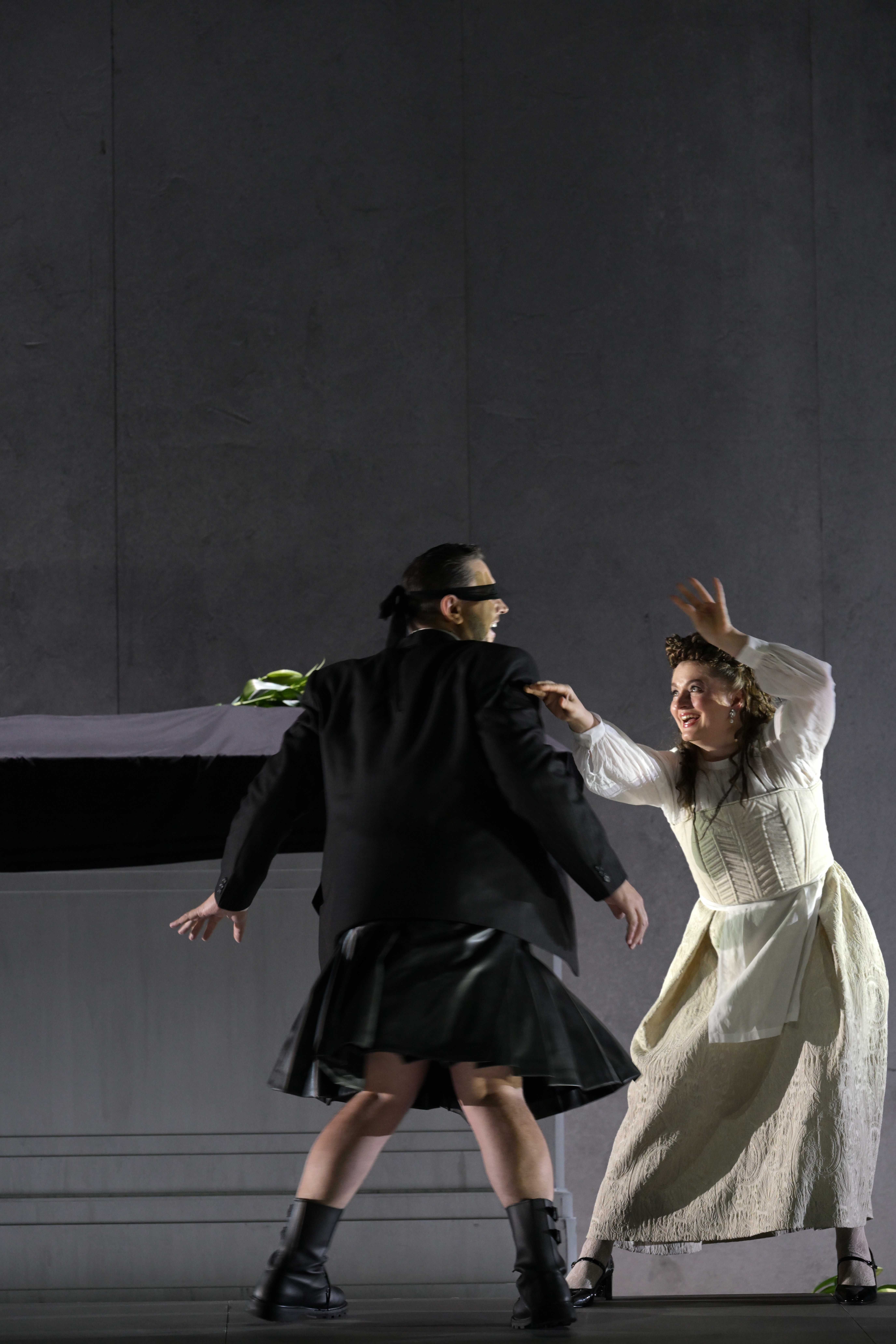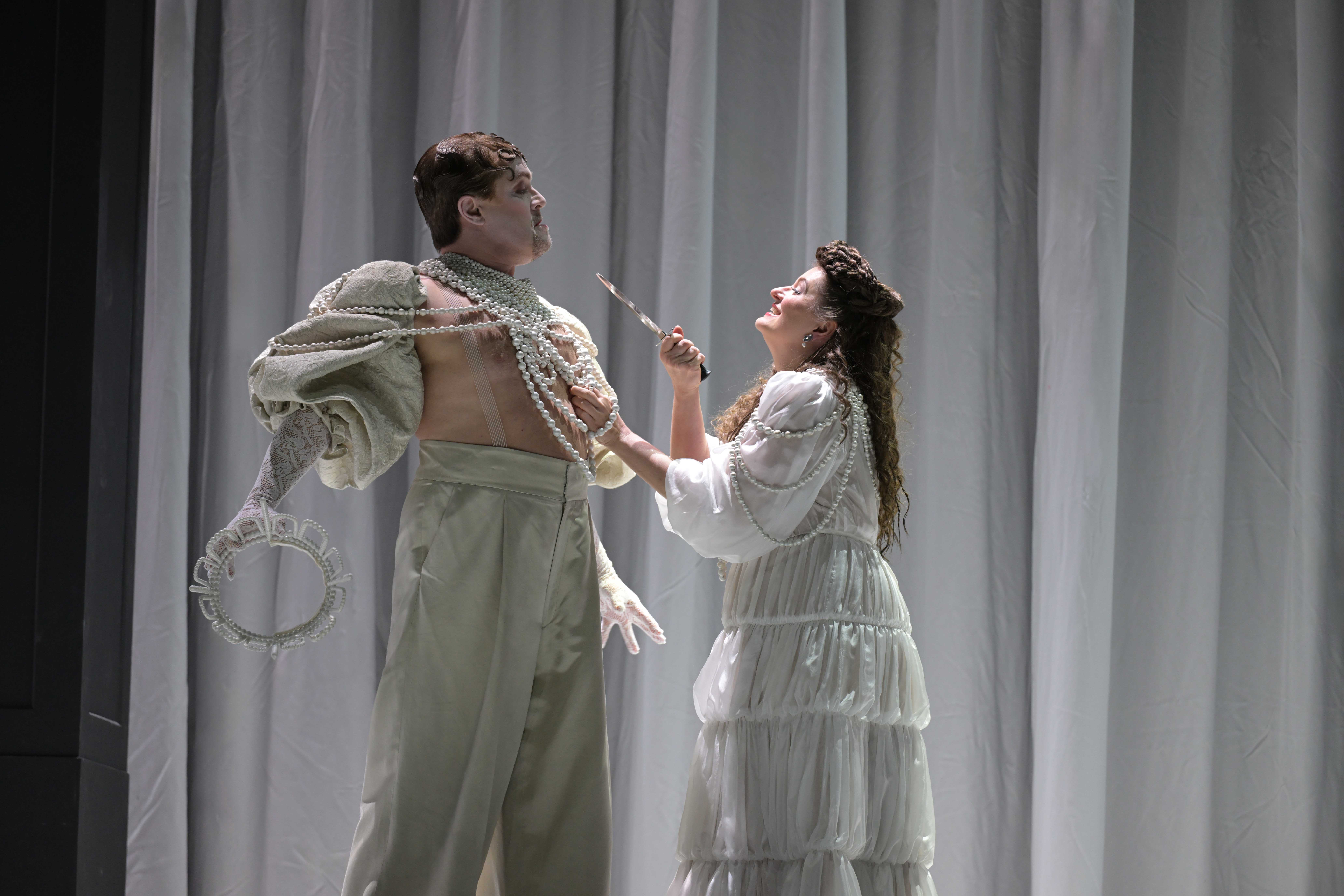 Créée en janvier 2024, la mise en scène linéaire et minimaliste de Nadja Loschky séduit d’abord. Les décors d’Étienne Pluss par leur simplicité, créent d’abord une sorte d’hypnose du regard, les sens étant sans cesse bousculés par ce qui se chante, tandis que ce qui se voit prend volontairement un aspect lisse, entre le blanc et les gris, comme la maquette longiligne d’une succession de pièces de palais sans relief qui défilent en permanence derrière les personnages.