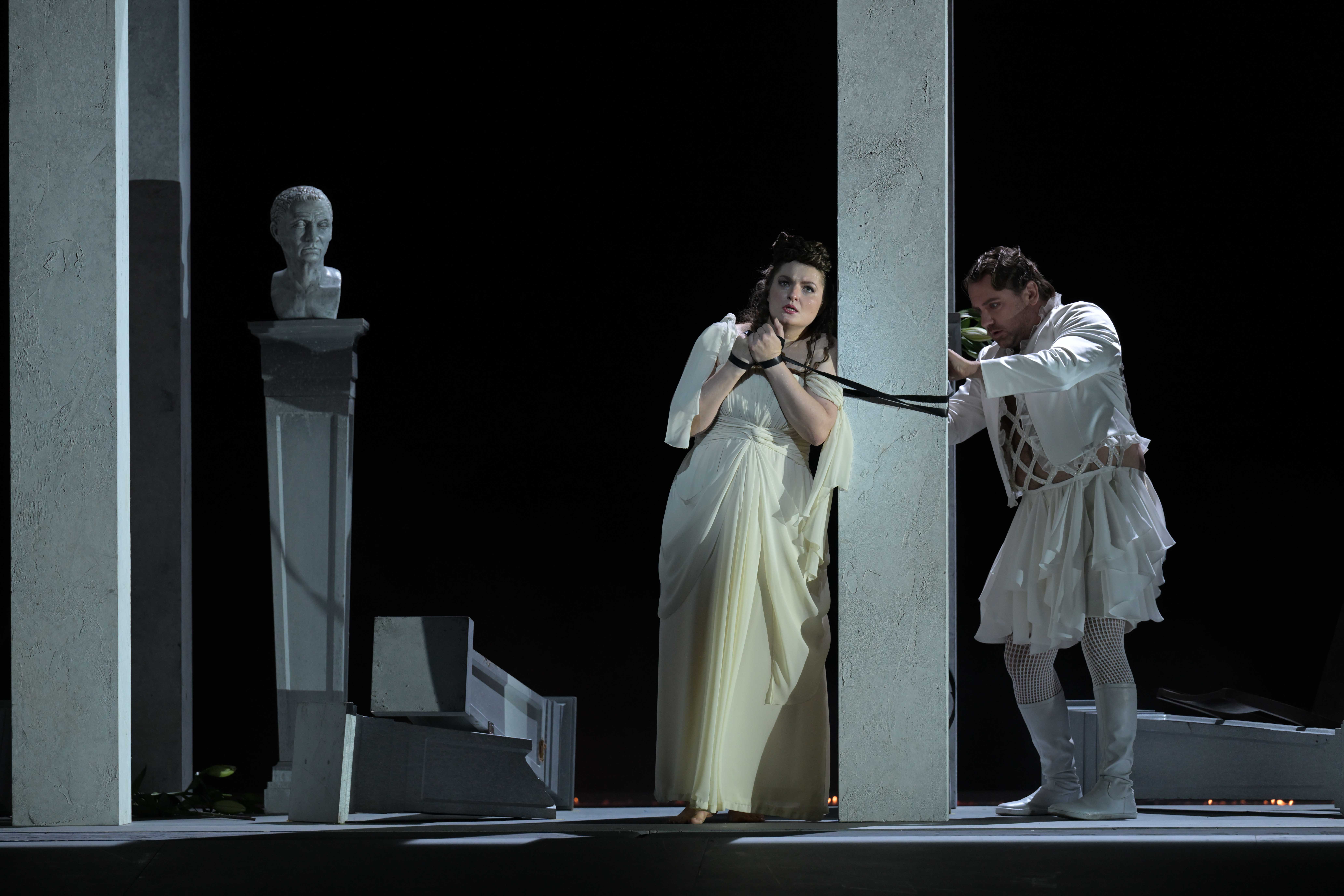 Le décor défile lentement de droite à gauche, presque imperceptiblement au début, et révèle peu à peu, tout à la fois la lecture macabre que la metteuse en scène fait de l’un des opéras seria les plus tragiques de Haendel, et sa volonté de souligner l’atemporalité des thèmes. On voit ainsi tout aussi bien des aspects antiques comme l’alignement des statues-colonnes sans pilastres, ou les piédestaux portant le buste de César, qu’une salle de bain moderne, un réfrigérateur, une salle d’armes de notre époque, un escalier montant vers les cintres.