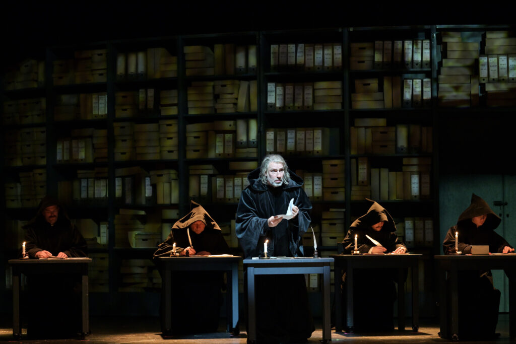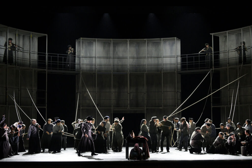 Le prologue se divise en deux tableaux et scènes de foule que Warner assume comme telle lui donnant un décor volumineux, sorte de paroi grise incurvée avec coursives en hauteur, d’où de longues cordes descendent symbolisant le pouvoir des tout-puissants sur leurs administrés réduits en quasi esclavage. L’innocent, le fou est déjà là, semblant sortir du ventre de Boris Godounov et rampant sur le sol avant de se lover dans un recoin. La foule a envahi le plateau, Warner ne mégote pas sur l’impression du nombre ni de la misère et la scène est proche du premier degré sans interprétation particulière au contraire des visions plus sophistiquées et compartimentées de Serebrennikov et Barkhatov récemment. Boris est sommé de devenir empereur puis il est acclamé lors de son couronnement. Il apparaît plus résigné qu’enthousiaste tandis que la présence de Dmitry assassiné l’obsède et le pourchasse.