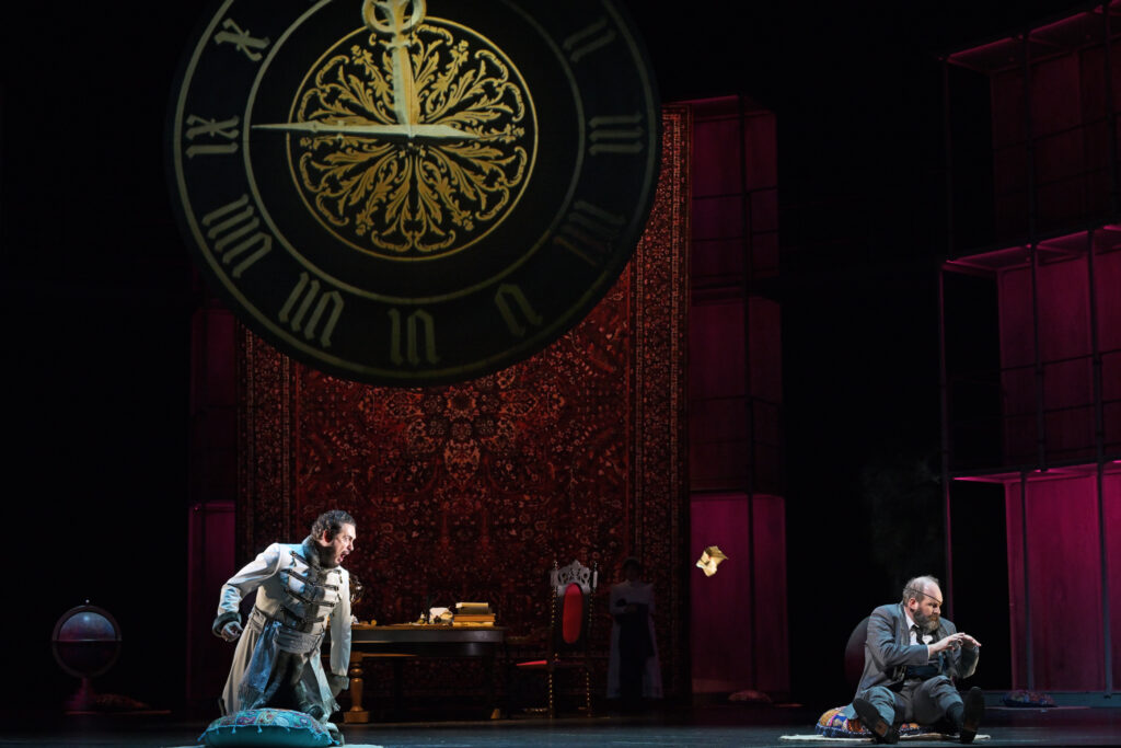 Mais le vrai contraste dans ce récit dont Warner souligne la linéarité et la logique, se situe lorsque l’on arrive dans la grande salle du palais de Boris Godounov qui règne depuis plusieurs années à présent : l’intimité est relative puisqu’à l’inverse des scènes de foule où l’espace se resserre, la grande salle du palais parait immense et presque vide, avec ce bureau majestueux où travaille un Boris très affairé, le magnifique tapis gigantesque qui orne le mur du fond et les coussins ronds qui entourent la pièce comme les marques d’une horloge qui tourne sur le sol et cette réplique au-dessus de la scène, une magnifique horloge dont les aiguilles tournent inexorablement tandis que les chiffres s’effacent, l’ensemble faisant place à l’issue de la scène, au mécanisme complexe qui régit le temps.