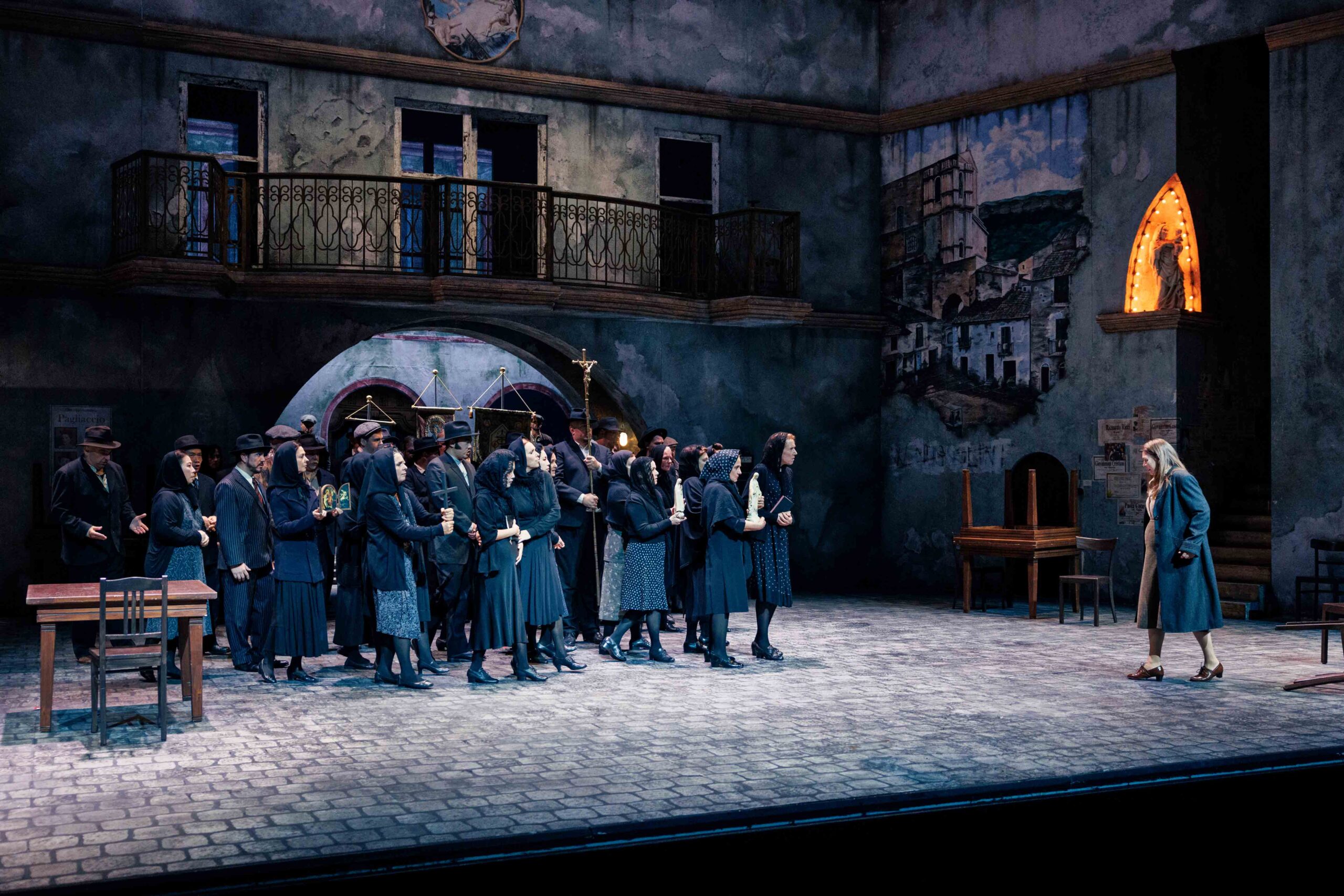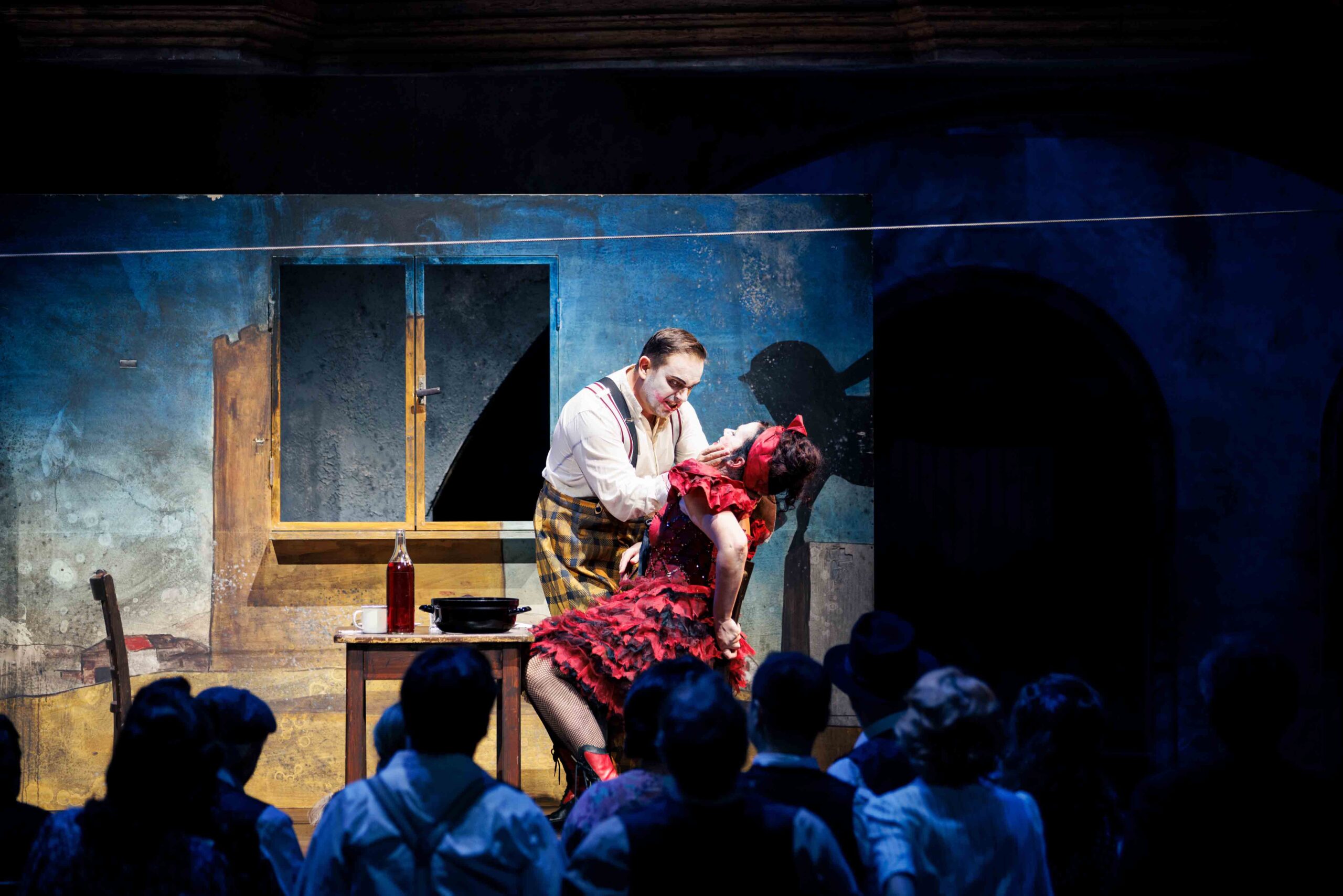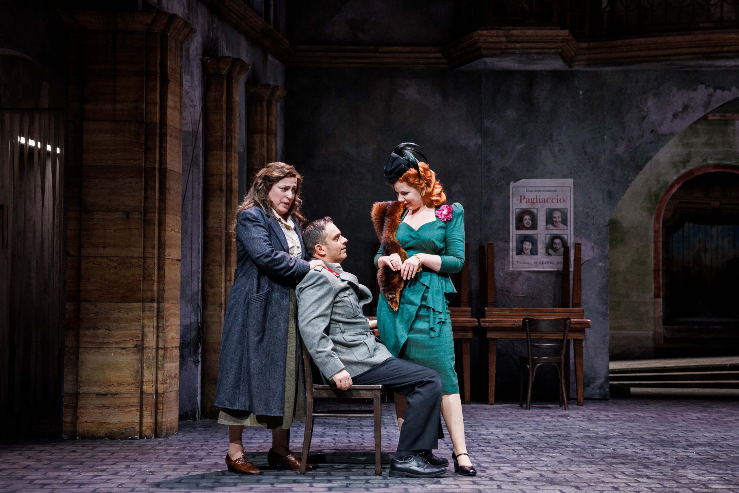 L’ensemble se passe en Italie dans une bourgade assez typée du sud, et dans une transposition temporelle qui fonctionne bien tant elle accumule les clichés de l’époque : nous sommes le 21 avril 1945, la date de la libération de Bologne des nazis, avant la fin totale de l’occupation allemande. Rappelons que Mascagni avait situé sa tragédie campagnarde en Sicile et Leoncavallo son paradoxe du comédien mis en abyme, en Calabre, donc juste en face.