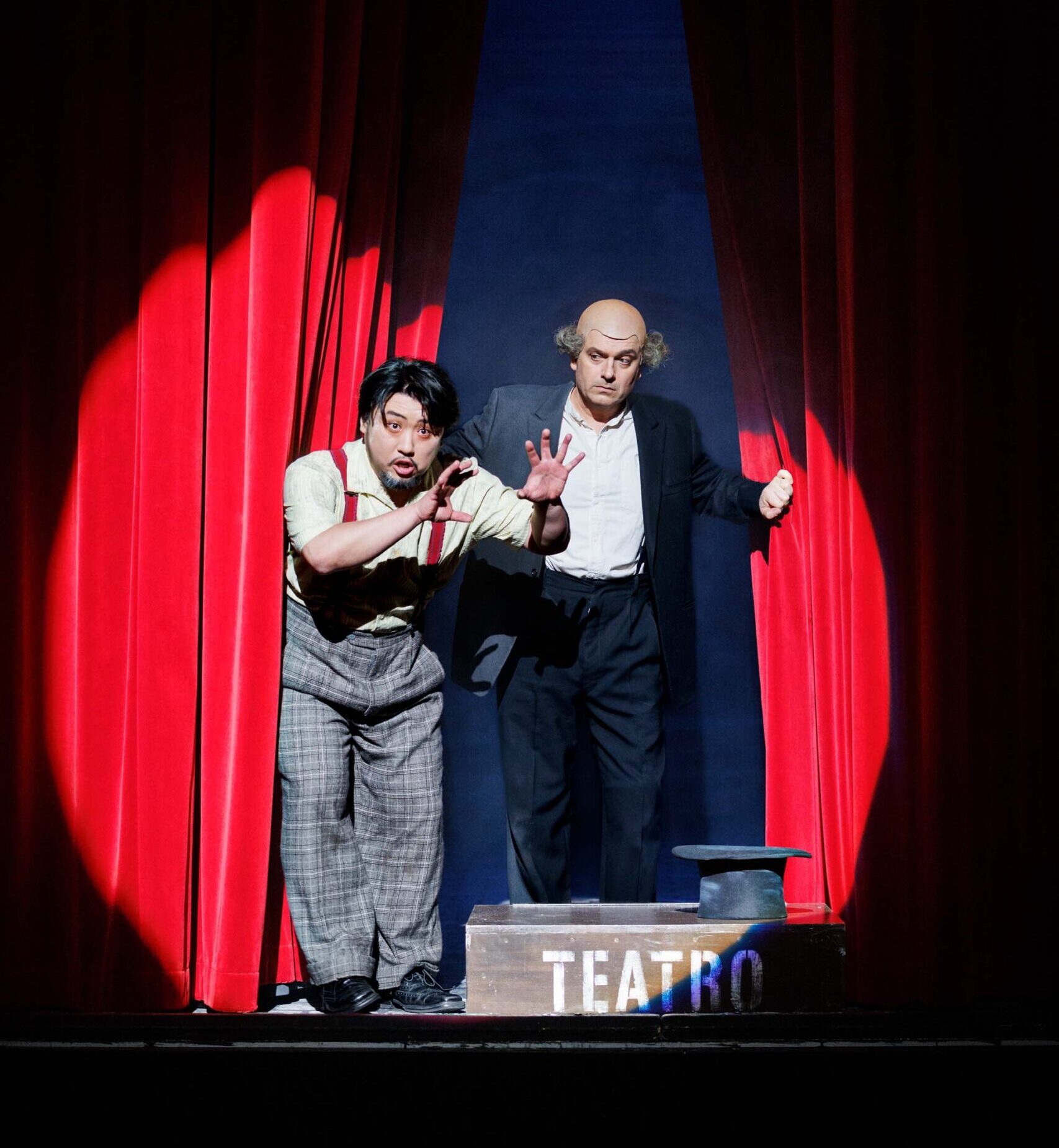 En lien avec la mise en scène filée, le même ténor (hier soir Jason Kim) incarne Turiddu et Canio, le même baryton (hier soir Kihun Yoon) chantant quant à lui le double rôle d’Alfio et de Tonio.