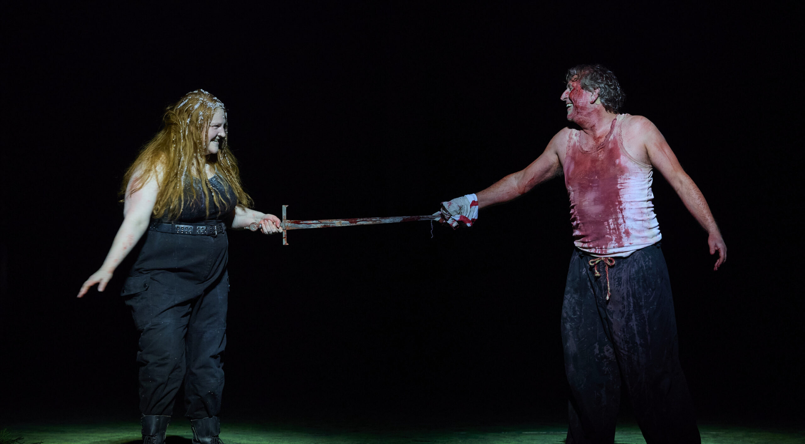 Entre les travaux, si les travaux et l’abnégation de Quasimodo restent, le monstrueux, les ornements de la gitane et les réflexes des titis parisiens passent au deuxième plan. En Clopin qui exprime la rumeur, Arthur Daniel fait entendre les mots de Hugo pour aujourd’hui. Le beau Phébus (Martial Piaulat) est un peu queer mais reste un séducteur. Et surtout la scène d’amour voyeuse où Frollo observe Esmeralda et Phébus parvient à mettre mal à l’aise sur ce qui ressemble à un double viol sans priver l’héroïne de sa propre sensualité et de son propre rythme- qu’elle aimerait maîtriser. Plus Jeanne d’Arc blonde en survêtement sportif que Bohémienne ornementée (sauf pendant le carnaval), Jeanne Menoche incarne par son corps et sa voix un pureté de plus en plus abstraite et libre de clichés.