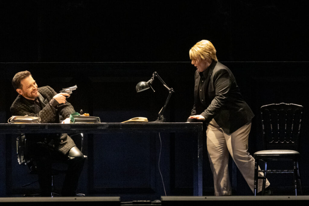 Cela n’empêche cependant pas le spectacle d’avoir une indéniable puissance due à une progression dramatique particulièrement pertinente, de scènes fortes en scènes fortes. Les relations entre les personnages sont tranchées et le contraste entre la Semiramide dominante, sûre de sa suprématie sexuelle avec son bustier très échancré et ses talons aiguilles, avec l’Arsace blondinet, fagoté comme un premier de la classe et l’Assur (ancien amant ?) avachi et souvent pris dans les brumes de la drogue est judicieux.