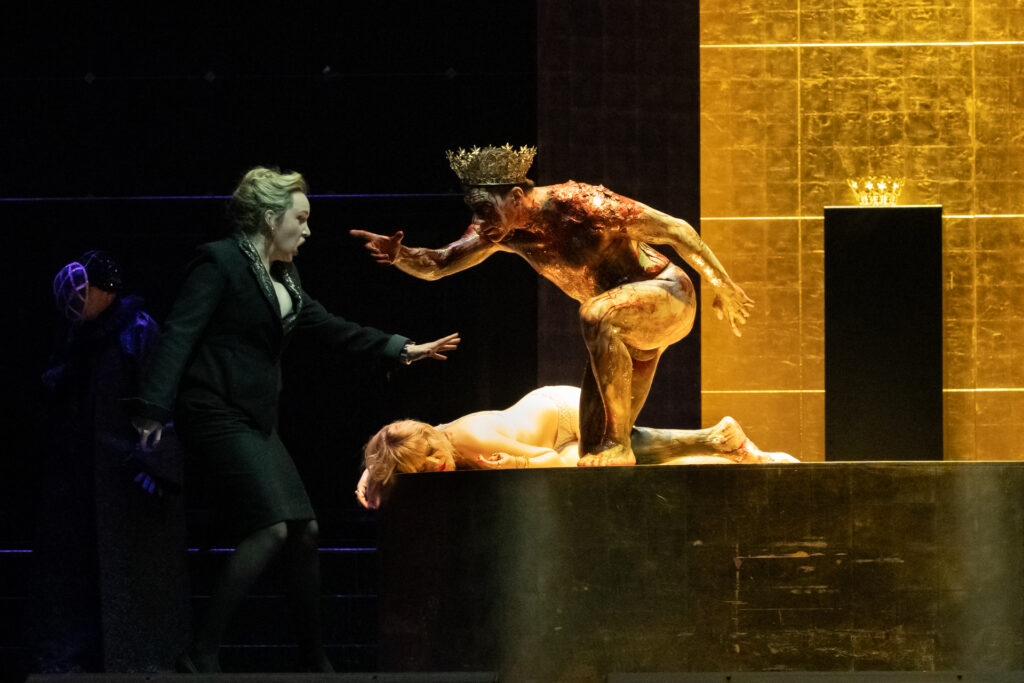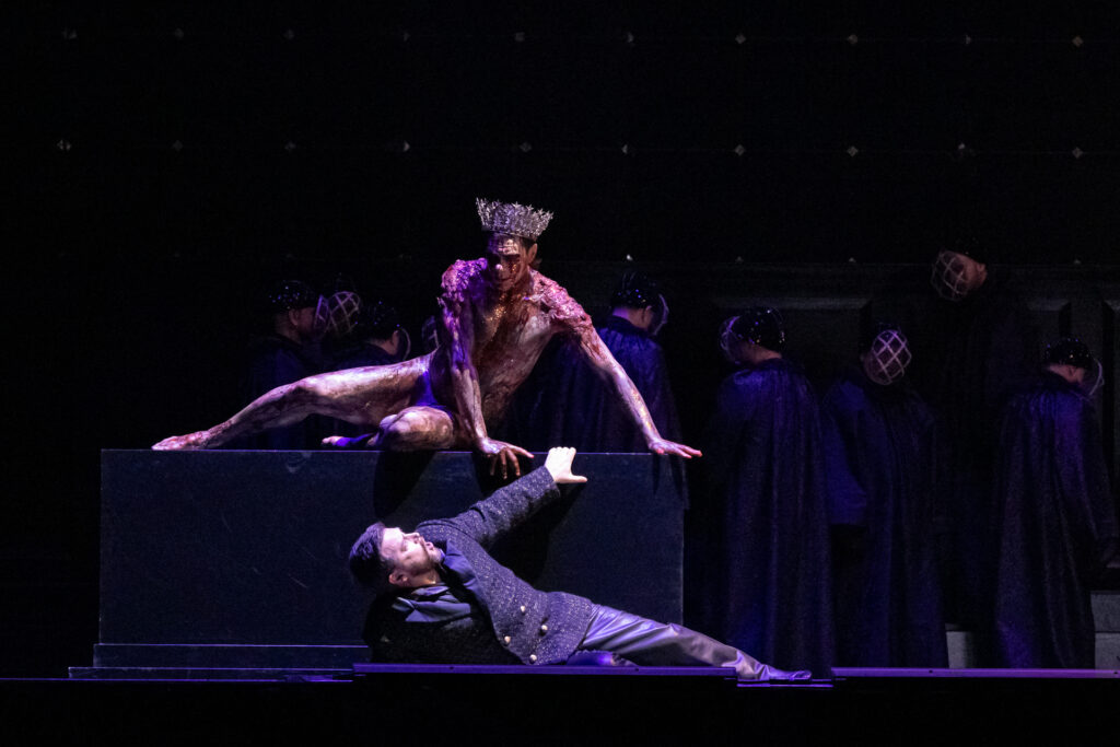 Quant aux interventions du fantôme quasi shakespearien du roi – fascinant Francesco Russo couvert de sang et de poudre dorée – , elles ajoutent cette part de sensualité mortifère que l’on peut effectivement rapprocher de l’ambiguïté sexuelle et criminelle des vampires.
