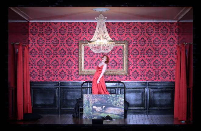 La succession de tableaux représente d’abord Marguerite au rouet tissant un long fil rouge que l’on retrouvera à la fin, lors de la scène ultime alors que l’Homme disparait dans un halo de fumée. La mort s’invite sous la forme d’un corps inerte près d’un champ de blé. Puis nous pénétrons dans une salle d’autopsie, froide et aseptisée où le médecin légiste – l’Homme du récit – va s’apercevoir avec horreur que c’est son propre corps qu’il dissèque. Rien ne nous est épargné, le cœur, les poumons sont exposés en bocal puis au mur, sans qu’on décèle clairement le lien avec les airs qui se succèdent. Changement de décor avec la succession de scène illustrant l’amour que portent deux parents à leur enfant et la mort terriblement injuste de celui-ci. Mais ni l’accumulation des affaires de la chambre du petit, amoncelées puis jetées, ni les images super-huit et tremblotantes de souvenirs heureux, ni le vieillissement subit des parents, ne parviennent à donner sens à cette tragédie à laquelle nous restons largement extérieurs.
