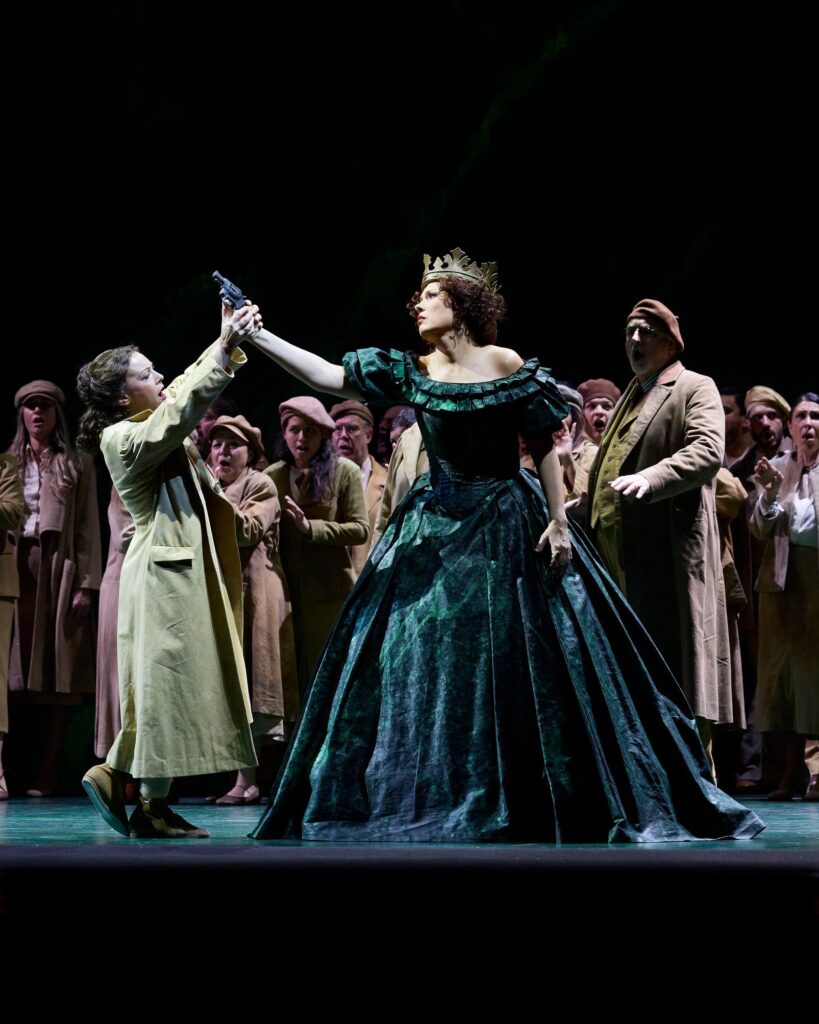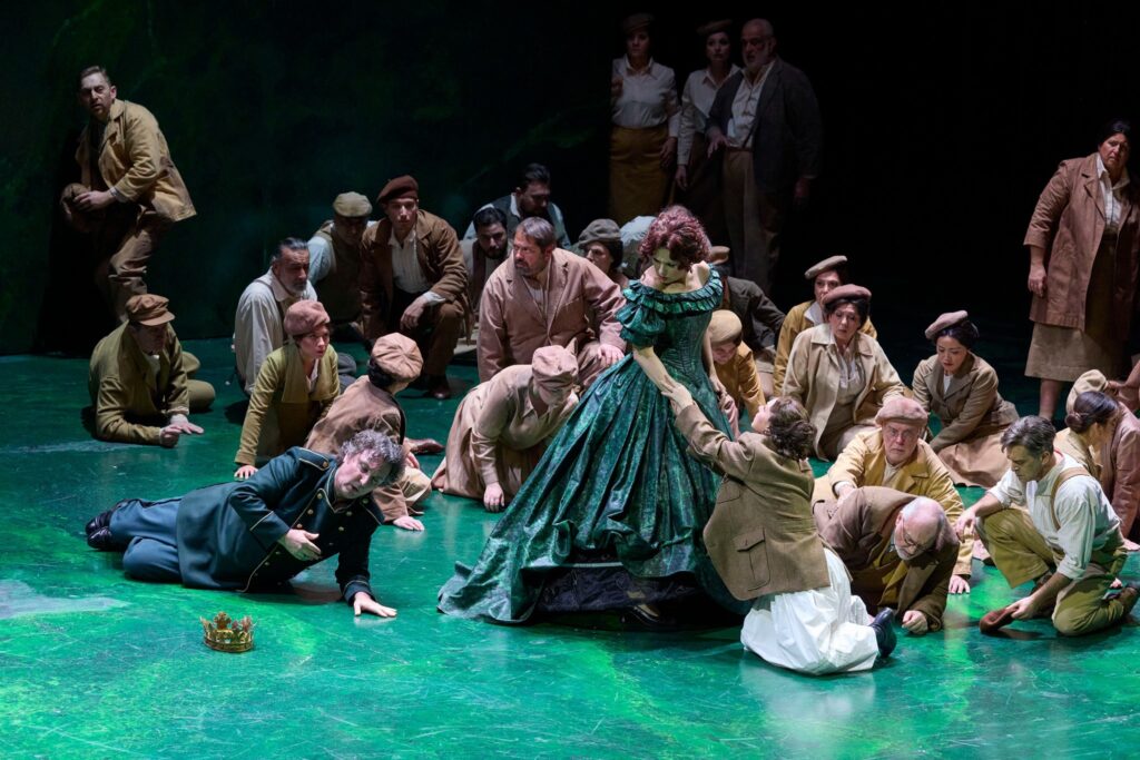 L’expérience montre qu’il n’est jamais aisé de mettre Nabucco en scène. L’option classique est souvent purement décorative et désuète ; l’option d’actualisation qui met en scène un peuple ou des migrants maltraités n’a pas que des partisans. Andreas Homoki a, lui, choisi de placer l’action à l’époque de Verdi avec un monde (les royaumes italiens suppose-t-on) en train de s’effondrer sous les coups de boutoir de la Révolution, ce qui entraine une lutte pour le pouvoir entre la bourgeoisie et l’aristocratie, et une femme (Abigaille) qui tente de sauver ce qui peut l’être. Mais cette lecture s’avère vite artificielle. L’univers est organisé autour de la couleur verte (couleur associée à certains des anciens royaumes et figurant dans le drapeau du pays) d’un mur tournant et de mouvements des figurants qui frisent souvent le ridicule. Quant au remplacement du poison final par un pistolet, on en cherche encore l’utilité…