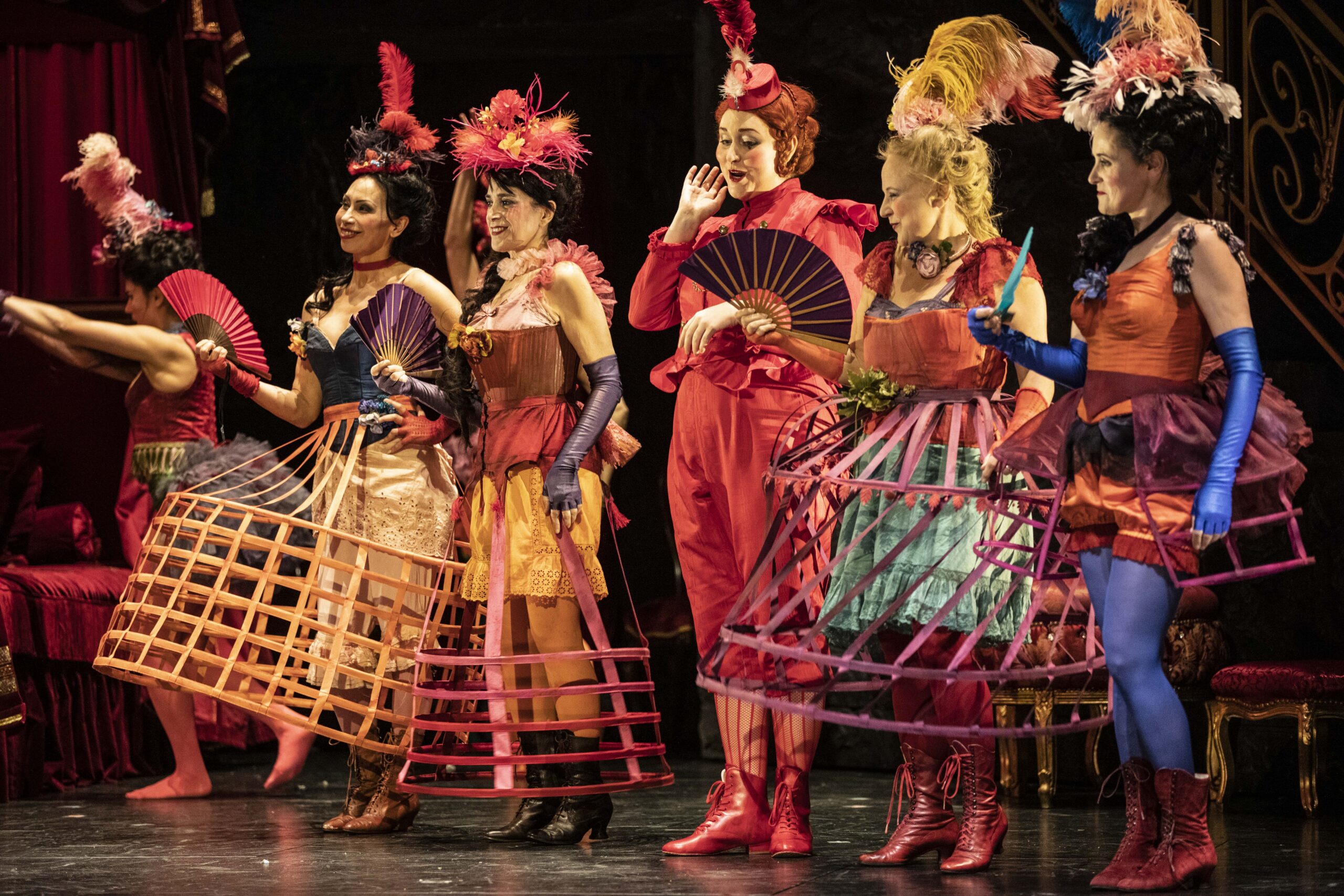 Au deuxième acte, où la couleur rouge domine l’ensemble du décor, les portes des coursives s’ornent de rideaux d’où les artistes de cabaret entrent et sortent, Manon se prélasse dans une alcôve évocatrice, vêtue de robes invraisemblables et très inconfortables d’ailleurs. Le lit se transforme en carrosse pour la fuite ratée.
