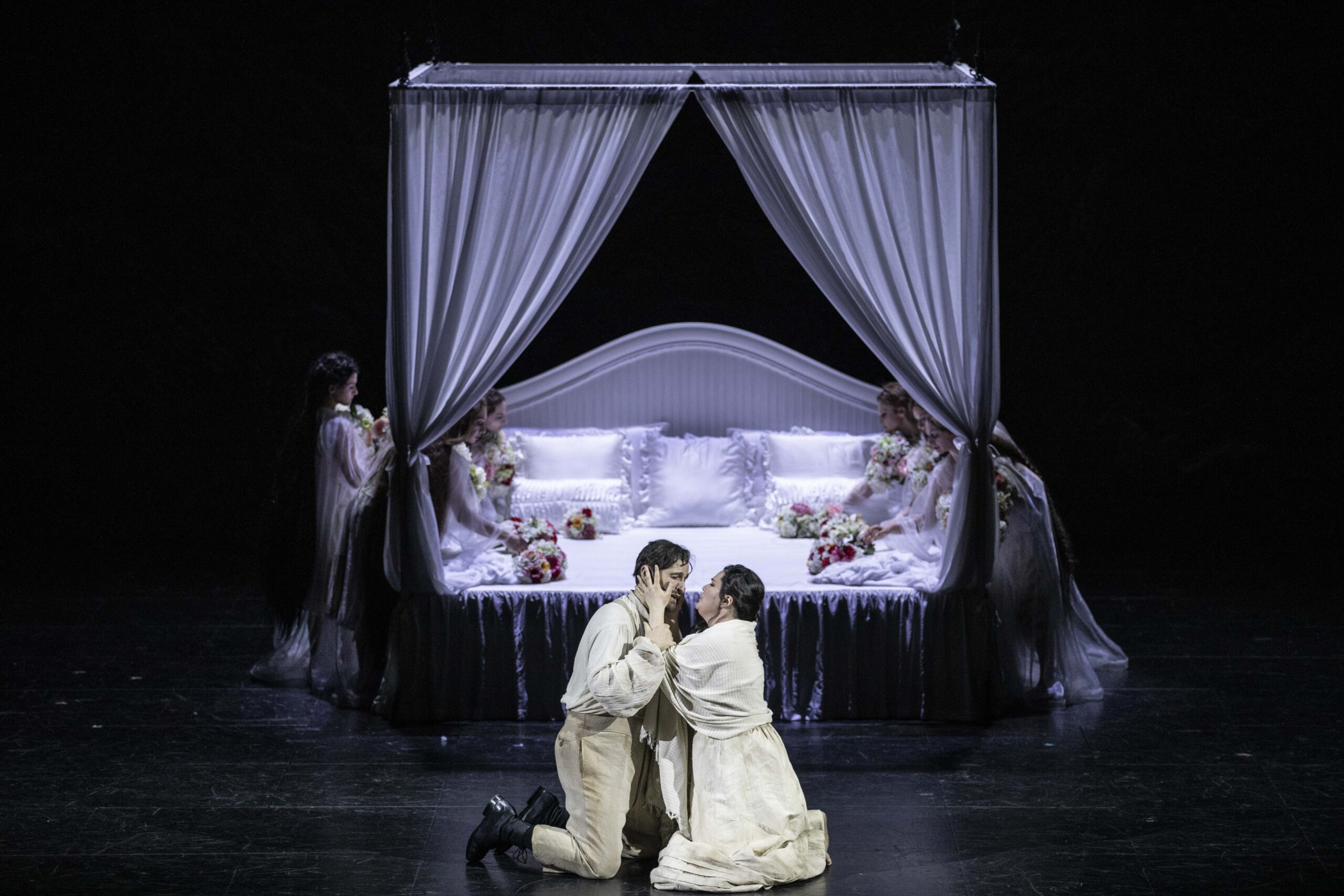 Au troisième acte, où la grisaille triste de la prison domine, les portes-fenêtres sont devenues grilles de cellules, les filles tout en blanc, sont pourchassées et maltraitées par les soldats dans un ballet très « dantien » (on songe à l’arrivée des cigarières dans sa Carmen de 2011 à la Scala de Milan). Enfin lors du dernier acte, le début du duo se tient devant le rideau fermé et la fin sur le plateau totalement dégagé, nu, juste jonché de dizaine de bouquets de fleurs façon funérailles tandis que l’alcôve réapparait à l’ultime air de Manon, cette fois toute tendue de blanc. Et, il faut bien le dire, sans une réelle direction d’acteurs dans ce vide peuplé par une demi-douzaine de jeunes filles virginales portant des bouquets mortuaires à la pauvre Manon, on se surprend à n’être guère ému par le drame qui se joue devant nos yeux.