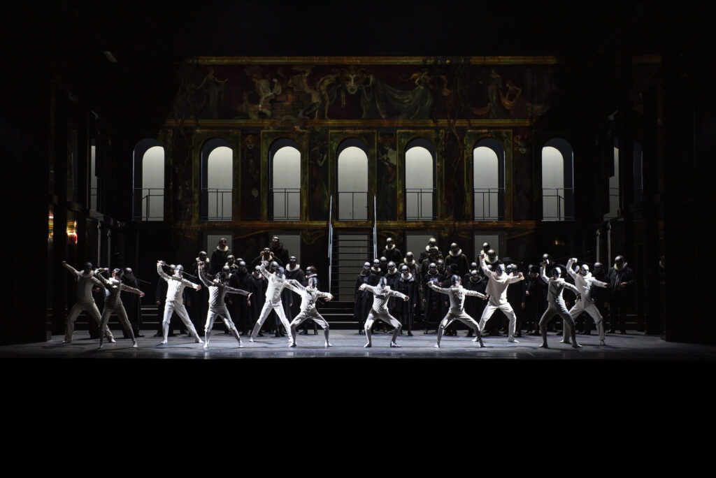 Si la mise en scène de Luca de Fusco a débuté par une belle image d’une foule sous la pluie portant des masques de têtes de mort, celle-ci s’est avérée finalement bien conventionnelle, avec un recours bien trop systématique aux vidéos utilitaires souvent, envahissantes parfois.