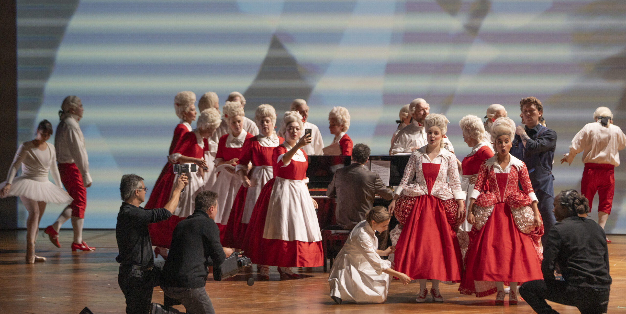 La basse britannique, Matthew Rose, dans le rôle du Baron Ochs von Lerchenau, semble investir la scène avec une apparente bonhomie assumée et une séduction décomplexée d’un homme du XVIIIe siècle qui vit en cohérence avec les mœurs de son époque. Mais à l’ère de « #me too » et de la cancel culture, Waltz réserve un sort plus sinistre au sulfureux Baron. Les photos de Dominique Strauss-Kahn et de Harvey Weinstein dans la brochure sont là pour nous le rappeler. Entre les deux temporalités de la masculinité avec lesquelles jongle Matthew Rose plus ou moins habilement, on retrouve un Baron von Lerchenau confus et un peu sonné, tel un cousin rustre de la campagne qui aurait subi un cours intensif de Judith Butler sur la performativité du genre. Le personnage flamboyant se trouve étouffé par le politiquement correct de notre époque et même la superbe voix de Rose semble trahir un regret cafardeux.