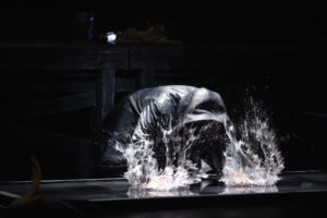 Car, à rebours du livret, la fin de l’histoire interroge : Senta, que le Hollandais veut recouvrir de son manteau pour la protéger (« Aber sollst du gerettet sein. /, Mais tu dois être sauvée. ») est tuée d’un nouveau coup de fusil par Erik (sur « In Ewigkeit » / Je renonce à jamais au salut, chanté par le Hollandais). C’est alors qu’elle reconnaît son frère, grâce à une tache sur son bras qui est la même que la sienne. Nous voici chez les Wälsungen, l’inceste pointe le bout de son nez, pour quoi faire ? La filiation entre Daland et celui qui est donc son fils n’apporte rien à l’affaire non plus. Alors que le Hollandais s’allonge sur le dos dans le bassin, Senta le rejoint pour mourir avec lui, sur son corps, dans une sorte de Liebestod inattendue et déconcertante, car elle n’est finalement pas morte aussi volontairement pour son bien-aimé que le livret ne le voulait, pour le délivrer de sa malédiction. Certes, elle s’avance face à un Erik fou de rage, un peu comme Carmen face à Don José, pour provoquer sa mort. Ce stratagème permet d’éviter à la metteuse en scène de régler la question d’un saut de l’ange fort difficile à réaliser dans la pratique. Daland alors revêt le manteau du Hollandais, pour devenir à son tour passeur d’âmes ou de migrants, ce qui, bien sûr, crée une image très forte, consacrant la permanence de la malédiction (quoiqu’à l’envers de la filiation), mais déroute tout de même le spectateur, privé de la transfiguration des amants, ravalée au rang de féminicide sordide. L’excès d’idées ici est manifeste et la metteuse en scène gagnerait à simplifier sa narration pour la rendre plus efficace.