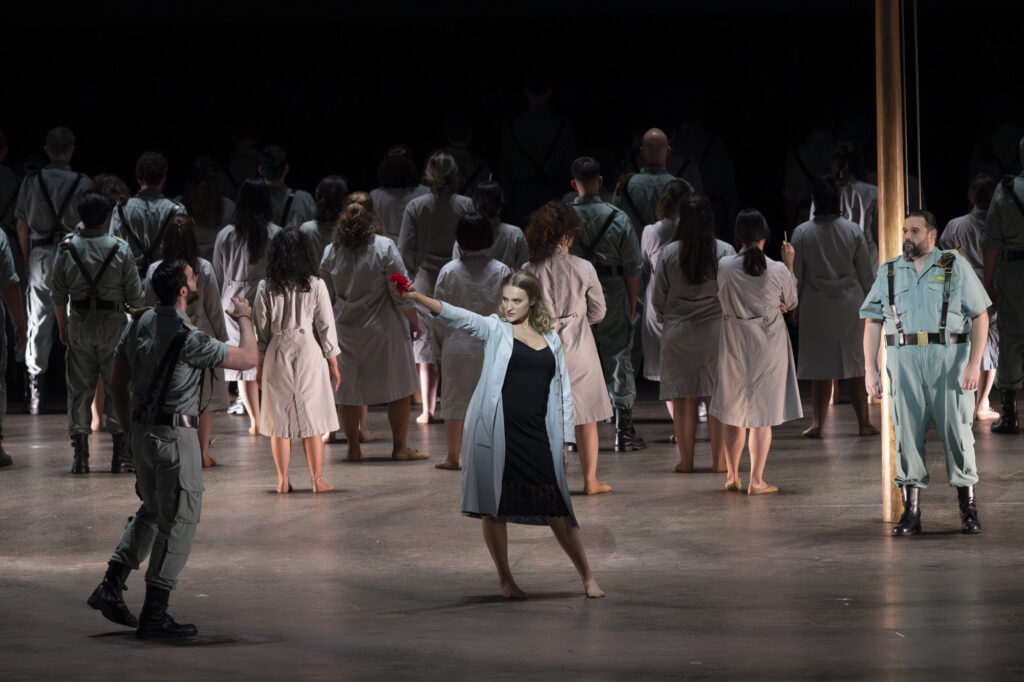 Elle a tant été vue, tant commentée, qu’il n’est pas forcément nécessaire de revenir sur la mise en scène de Calixto Bieito, d’autant que, depuis 1999 – date de sa création à Peralada -, elle s’est affirmée comme une référence absolue malgré les commentaires qui accueillent encore l’arrivée des voitures sur scène (…par des spectateurs qui n’ont toujours pas saisi que le silence est de règle à l’opéra). De nombreuses scènes sont puissantes, comme celle de la chute du gigantesque taureau ou celle de la masse excitée et sautillante des Chœurs face à la corrida.