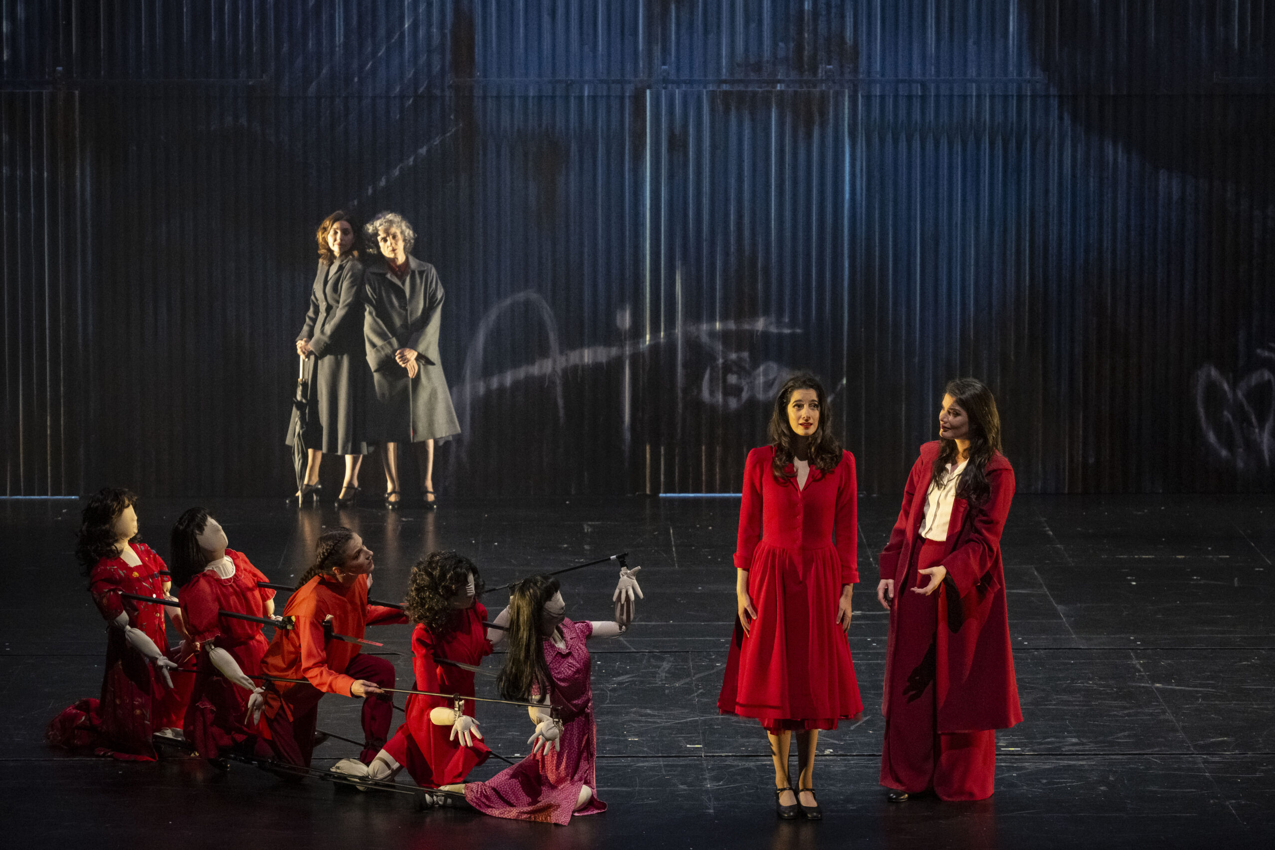 Maria, c’est à la fois la femme de Buenos Aires et Buenos Aires même. C’est la fille et la mère, la prostituée et la vierge. Son opéra est l’histoire d’un féminicide. Mais dès l’instant où la morte s’échappe du cercueil, cet aspect disparaît. Par la suite, il est à peine évoqué avec la figure génialement traitée de la poupée. Le choix est, dès lors, de montrer une femme puissante et omniprésente.