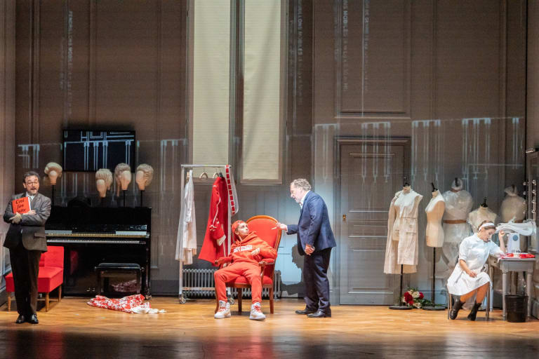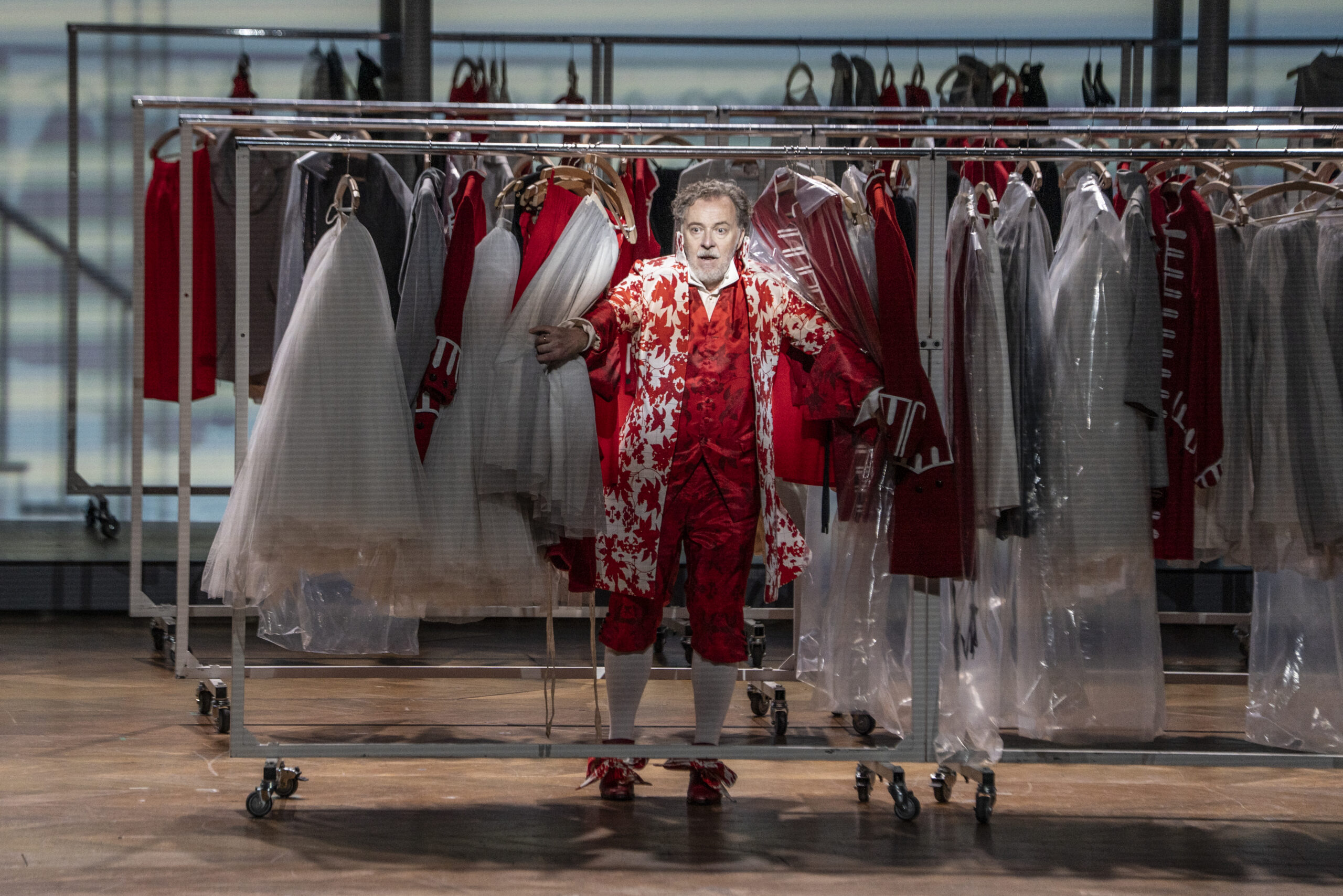 Ce sont les loges des artistes solistes de Garnier avec leurs hautes fenêtres d’où l’on aperçoit la rue et les immeubles Haussmann qui font face au Palais. Fauteuils tendus de rouge, élégants canapés, coiffeuses et costumes de scène sur cintre, l’ensemble est esthétique et évoque tout autant la transposition actuelle (Figaro fait ses mesures sur un portable) que la préparation d’une pièce du 18ème siècle (costumes et décors d’époque où dominent nettement le rouge et le blanc).