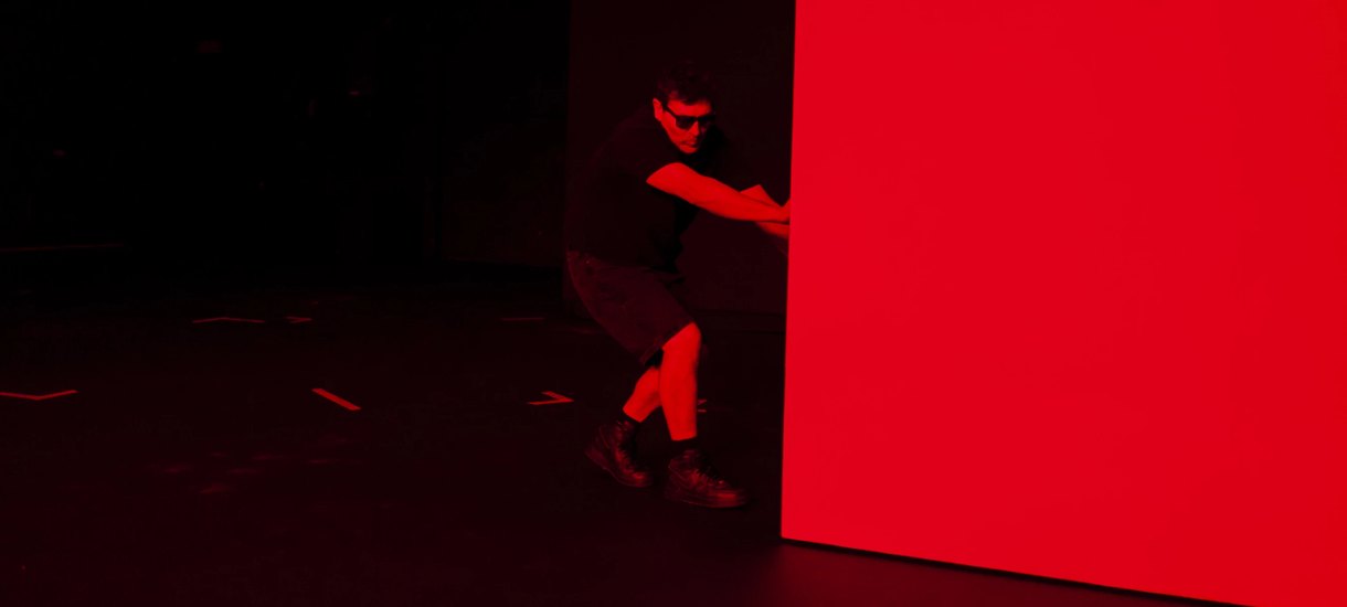 Le public est divisé en plusieurs groupes, aux noms délicieux. Nous sommes Les Citrouilles, c’est-à-dire le groupe orange. Nous sommes une quarantaine et nous passerons ces trois heures ensemble. Chaque parcours semble être le meilleur, et pour nous, la progression semblait évidente. Nous avons commencé par l’installation chorégraphique In absentia sur le plateau de la salle Gémier, vidée de ses sièges, puis nous avons été convié·e·s dans le grand foyer pour vivre le cabaret pur de Mr K et de La Barbichette. Ensuite, notre groupe s’est dirigé derrière ce même foyer, dans les escaliers Passy, pour découvrir le fascinant PowerBeauTom. Enfin, nous avons retraversé l’espace pour terminer notre parcours avec la diva Patachtouille en mode karaoké. Voilà pour le programme. Maintenant, entrons dans le détail.