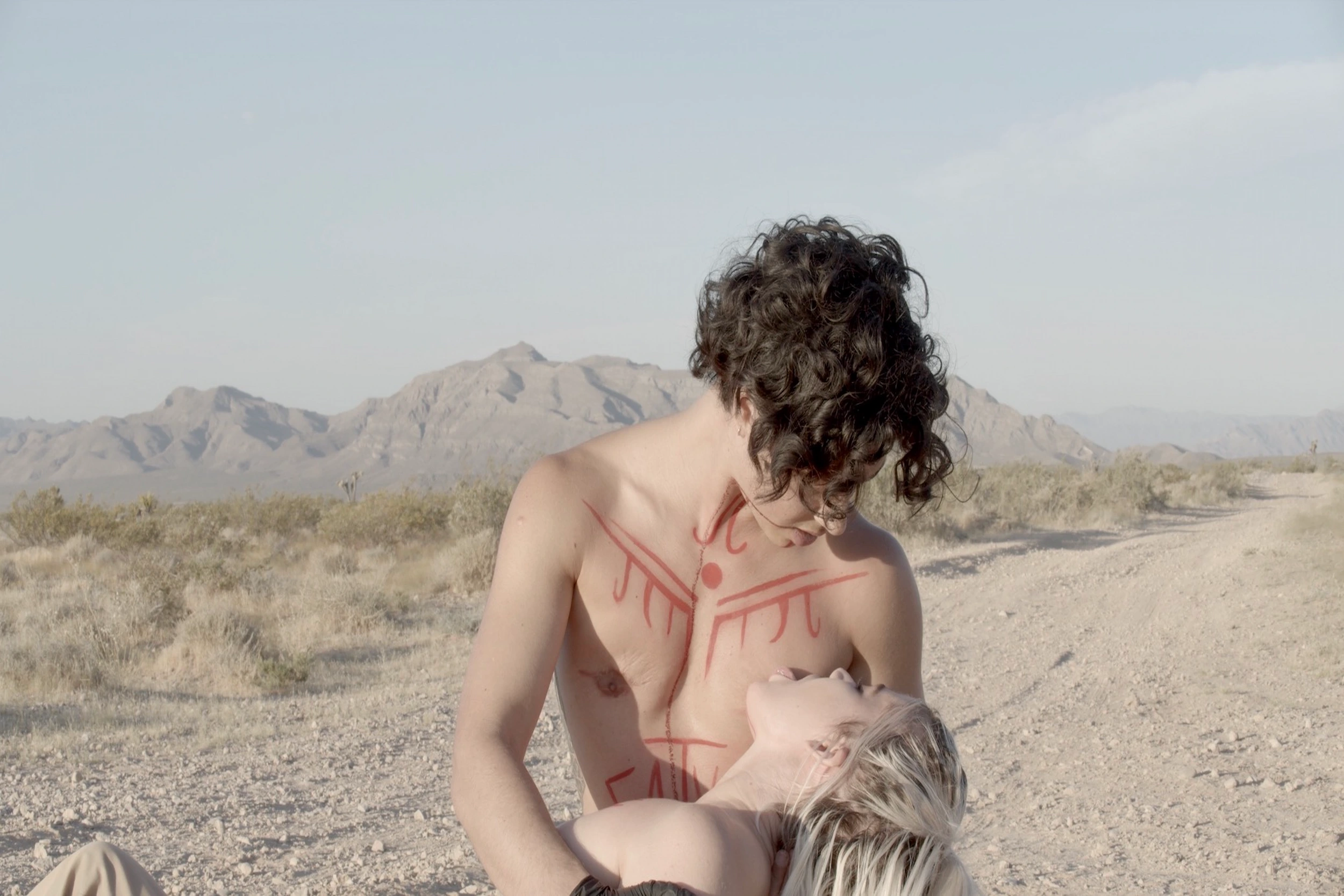 Les voir ensemble tient des mythes les plus grands de la littérature. Ces deux-là défient le genre à la fois de la passion et de ce qui est attendu lorsque sont prononcés les mots féminin et masculin. Nous voici face à cette idylle sublime qui passe par tous les états du doute, de l’angoisse et de l’amour pur. Samira fait des allers-retours au sens très concret du terme, nous sommes souvent à bord de la voiture qui roule, notamment jusqu’à un désert où le duo performe pour transcender l’idée de sexualité normée. Cela donne des images d’une force inégalée, comme ce baiser, les visages bandés comme chez Magritte, ou bien cette tétée de Samira au sein de Cade, pour devenir vampire. Car ces deux-là ont tout essayé ensemble, jusqu’à boire leur sang pour connaître le goût de l’autre.