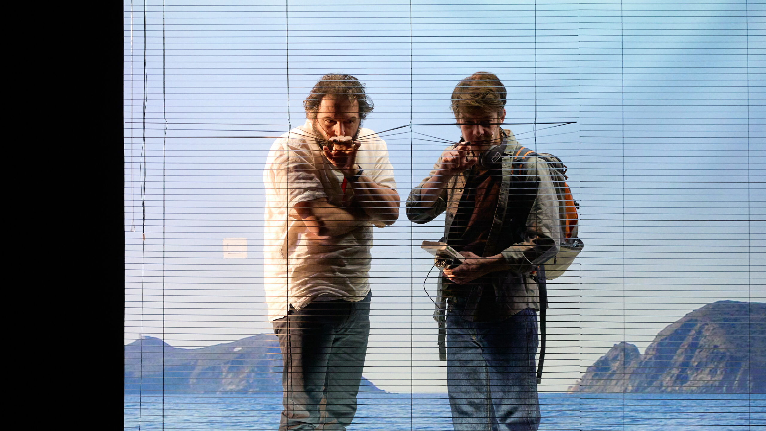 A moitié conscient, Moi comprend peu à peu, autant que le spectateur, que ses acolytes endossent plusieurs rôles. Tout se dédouble. Où se trouve la limite entre Günther et Moi ? Entre Cléo et la policière, Sophia et la commandante ? Qui sont les personnes dans l’étrange boîte vitrée, au fond de la scène, qui observent Moi quand il est seul ?