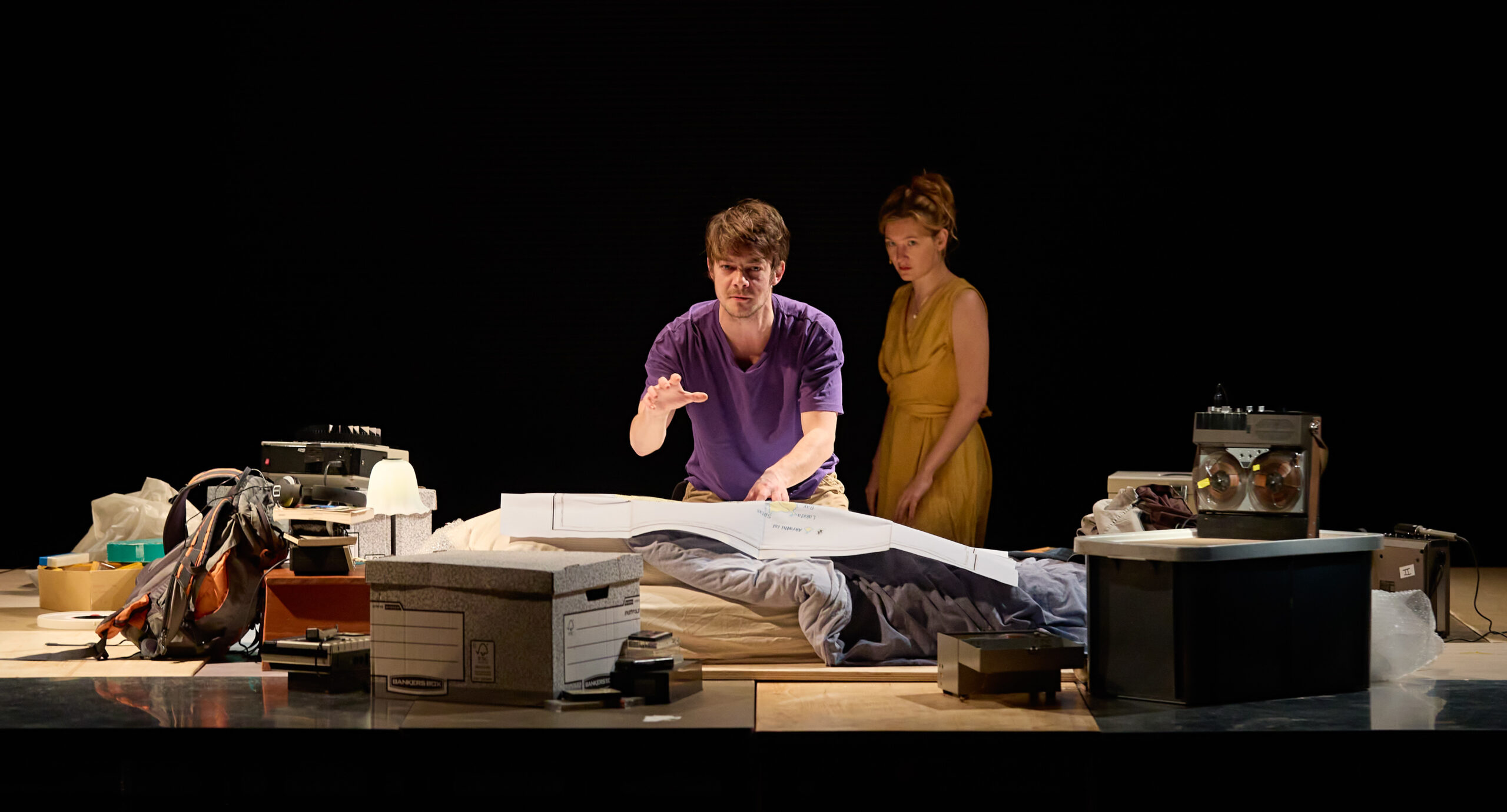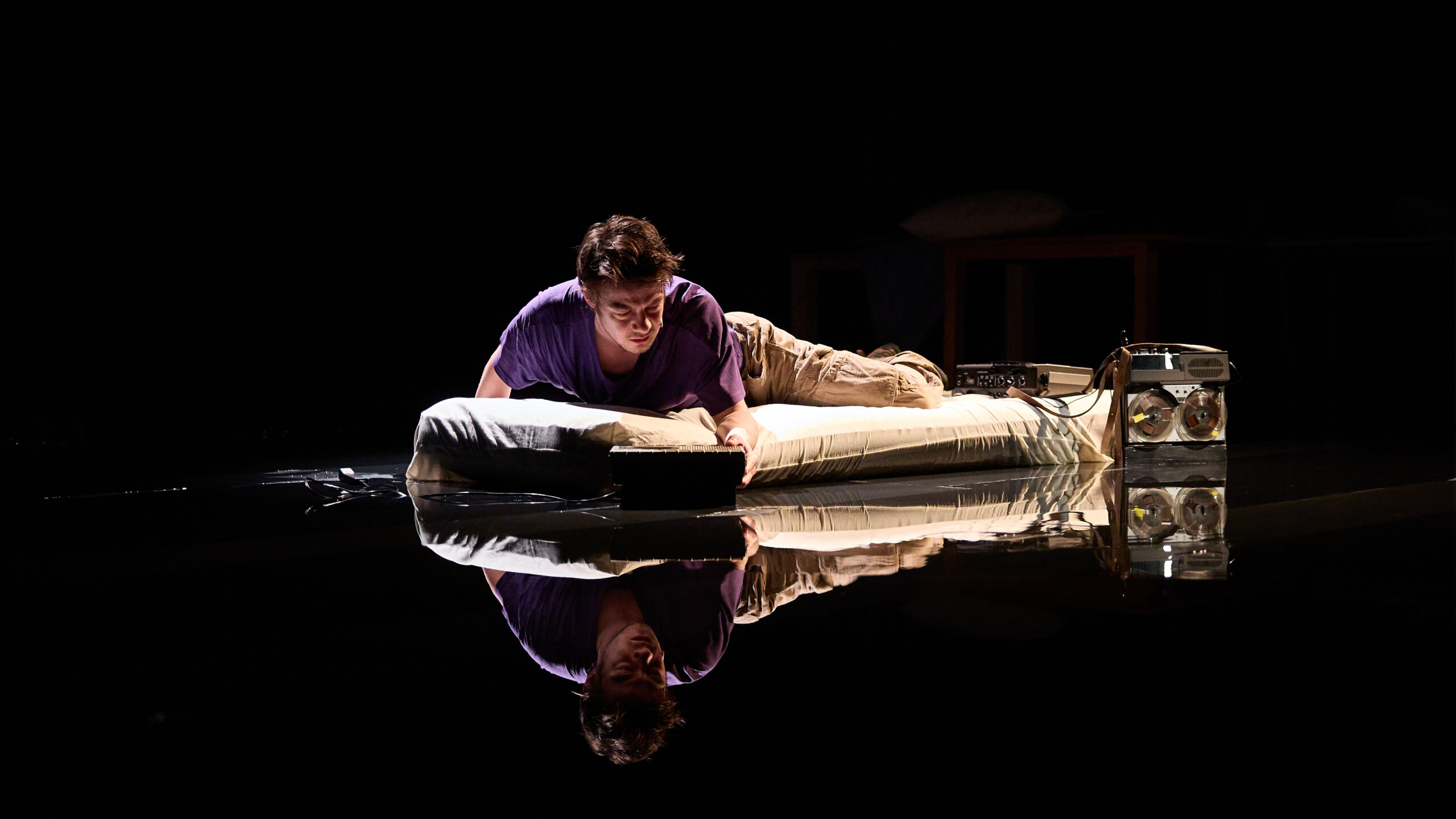 La scénographie aux allures cinématographiques d’Alban Ho Van est remarquable et vient ancrer une ambiance particulière qui intensifie l’étrangeté miroitante de la pièce. C’est sur une île de tables plantées dans l’eau que Moi se réfugie. Entouré de ses artefacts, des enregistreurs en tout genre, il recompose, écoute un ensemble de souvenirs. Représentant un espace indéfini, limitrophe, flou, l’eau est un élément central dans la scénographie. Le reflet de l’île sur le sol mouillé peut évoquer la division psychique du Moi, ajoutant à l’atmosphère une humidité étrange. Et, lorsque les personnages interviennent, pataugent les uns après les autres dans cette marre, ils viennent troubler l’eau, ils créent des ondes de choc.