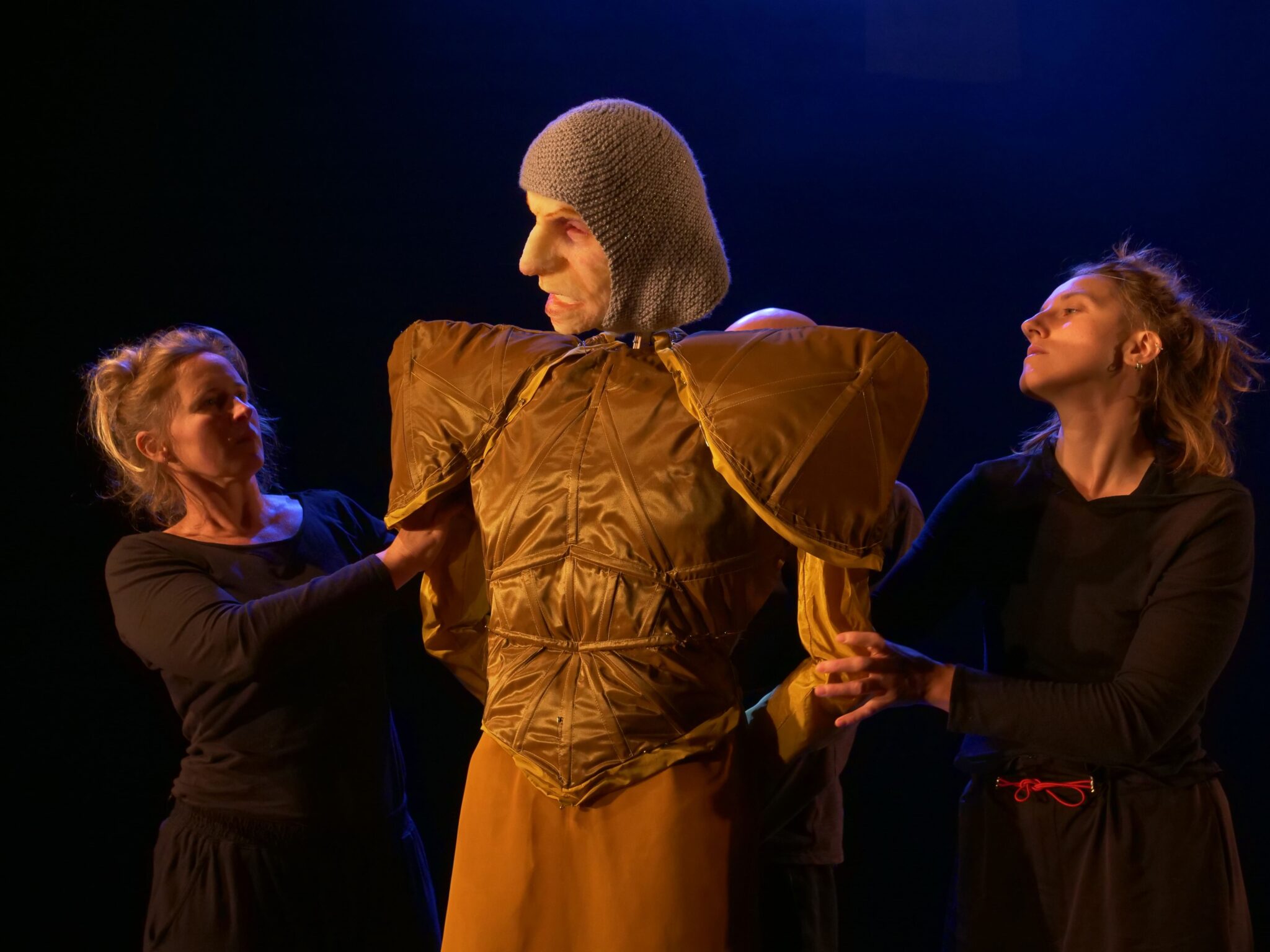 La relation entre la danse et la marionnette a été pensée en trois niveaux. Les trois danseur·euse·s-marionnettistes sont au service des marionnettes, il et elles se métamorphosent en soldats, gardes du corps, ou messagers. Il et elles expriment aussi les émotions des marionnettes et dansent leurs âmes torturées. Enfin, à la mort de Richard, les danseur·euse·s-marionnettistes se libèrent et l’on découvre leur vrai visage.