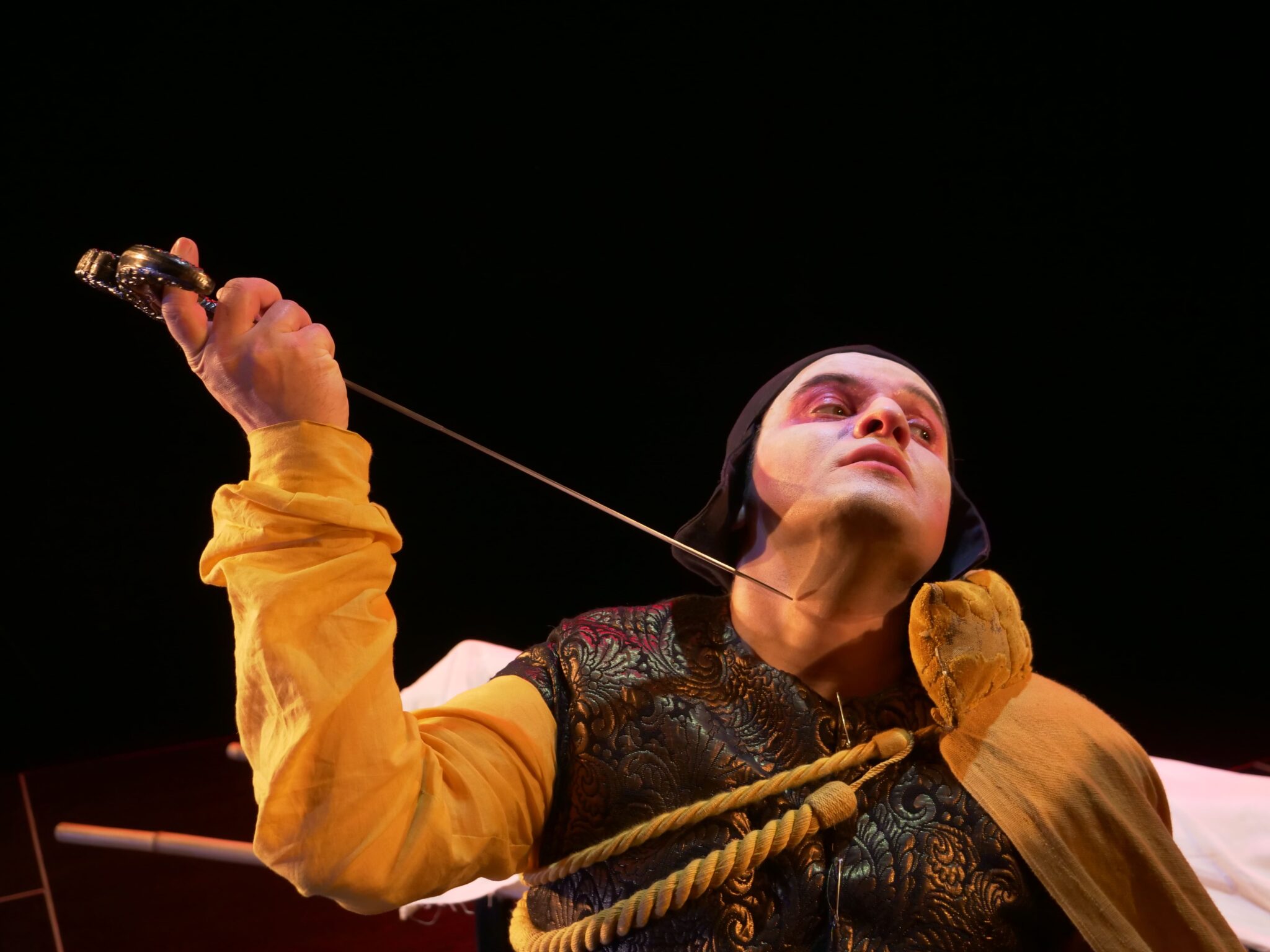 Vêtu d’étoffes dorées, le despote mène une partie d’échecs. Il déplace et éjecte les marionnettes les unes après les autres. Encore une fois, Yoann Pencolé donne vie à cette image et transforme la scène en véritable échiquier.