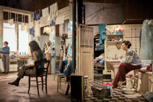 Dans la scénographie, nous sommes dans un appartement à la mode soviétique, en 1975, soit trente ans après les faits. La kommounalka, la maison commune, est extrêmement chargée : des valises entassées dans une chambre, des casseroles partout, des torchons qui pendent sur une cuisinière. On devine un piano, plus loin, une salle de bain avec baignoire.
