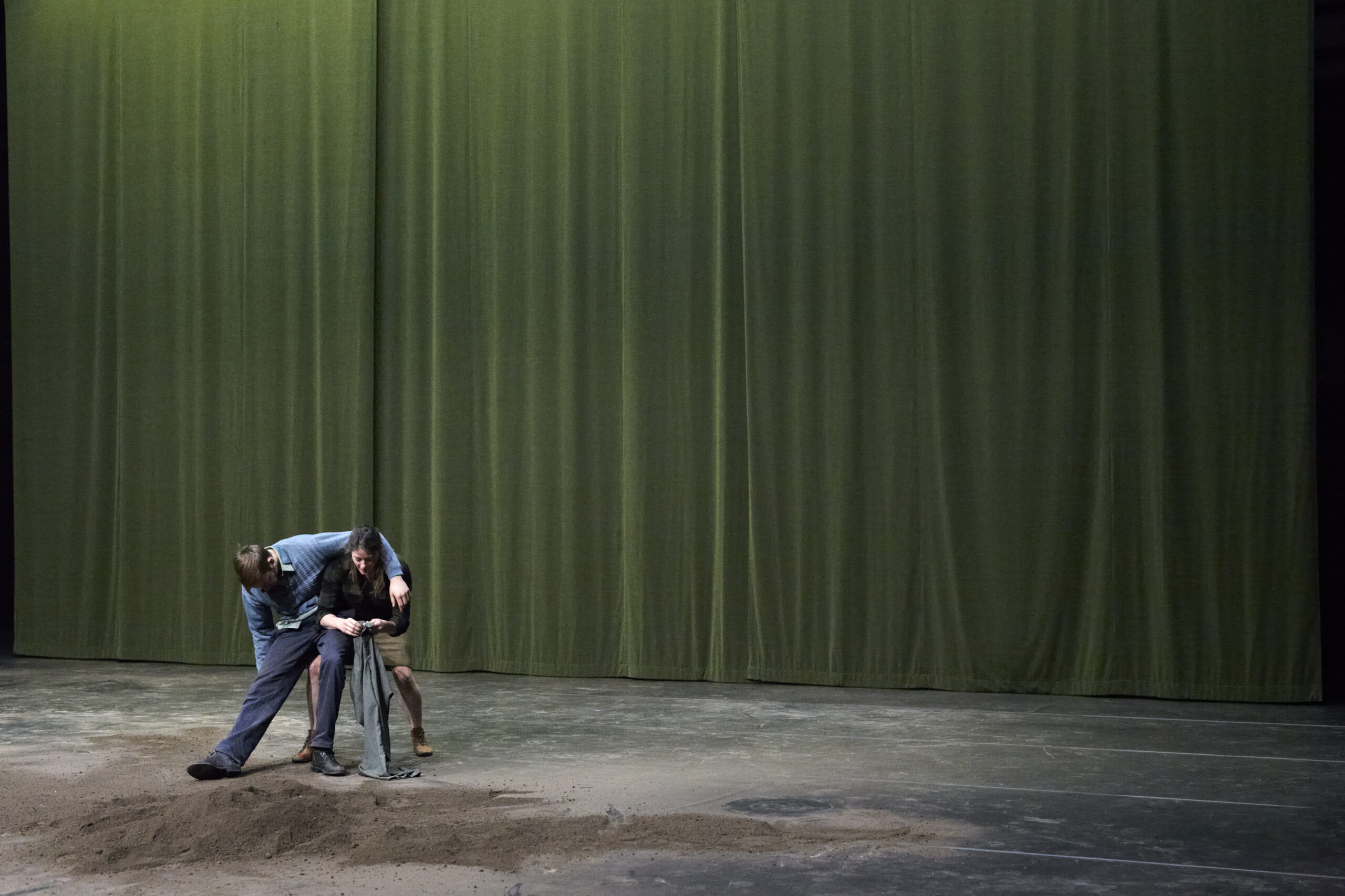 Dans ce spectacle, point de récit linéaire mais plutôt des monologues en différentes langues, des moments durant lesquels une extrême fragilité des corps se fait sentir. Des interactions entre deux corps expriment une tension, une quête d’équilibre et retiennent alors notre attention. Leurs gestes et leurs postures semblent absurdes ou de l’ordre du jeu. En rythme, les acteurs effectuent des mouvements physiques qui les mettent à l’épreuve d’une fatigue qui se fait sentir. Et pourtant, ils reprennent leur souffle pour effectuer d’autres actions tout aussi étranges, se cacher derrière le feuillage, jouer à faire voler des chemises et creuser dans le sable.