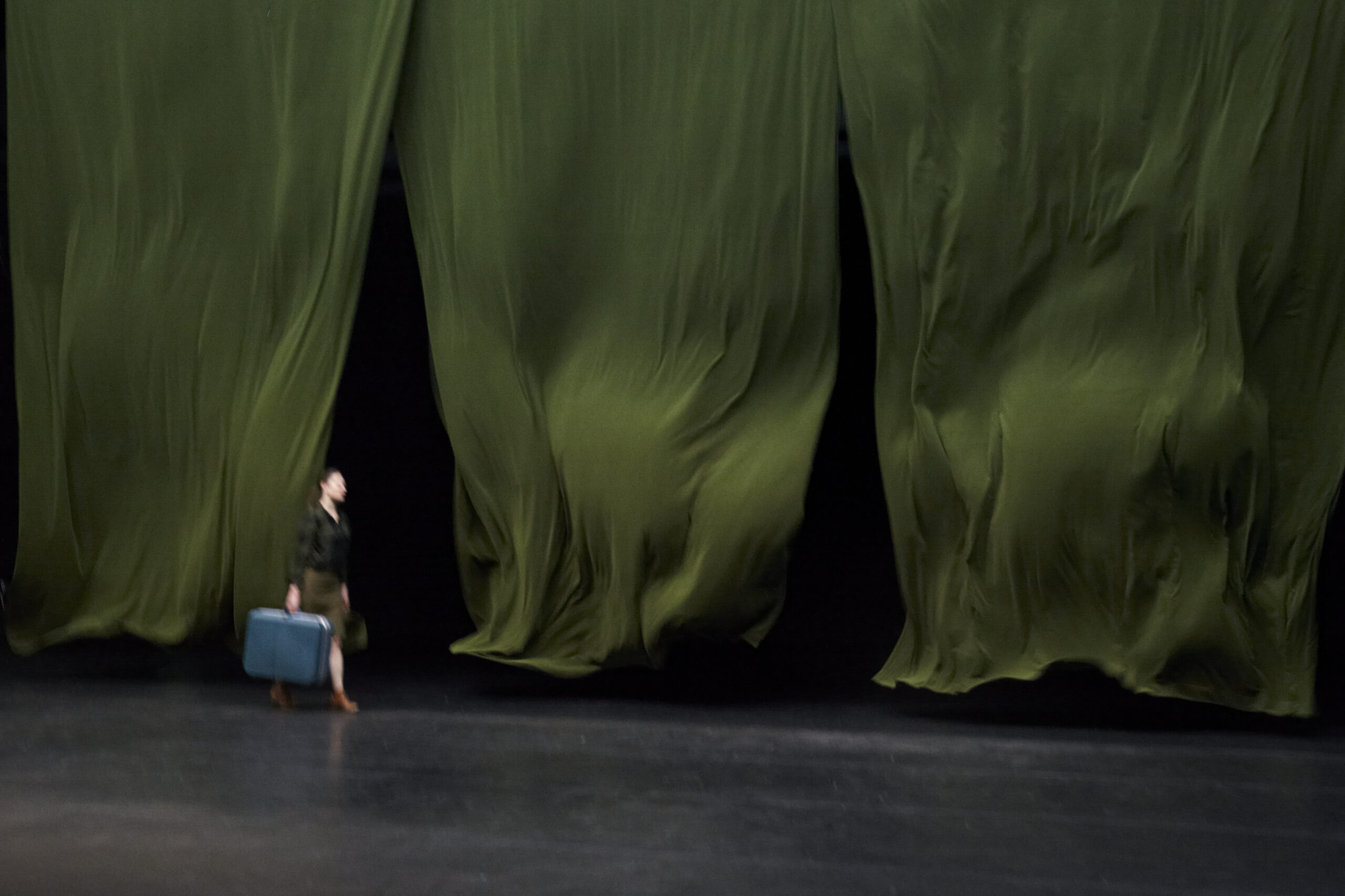 En ouverture, aux quatre coins du plateau, les acteurs manipulent une toile, suggérant ainsi le vent ou d’autres phénomènes météorologiques : une scène qui captive le regard. Les corps se mettent alors en action dans un moment où la force du collectif se fait sentir. Tout au long du spectacle, les protagonistes manipulent des matériaux, de la terre, de l’eau, des vêtements… La scène se reconfigure au fur et à mesure des moments de jeu avec ces éléments. Des sonorités ajoutent au mystère généré par les chorégraphies des acteurs.