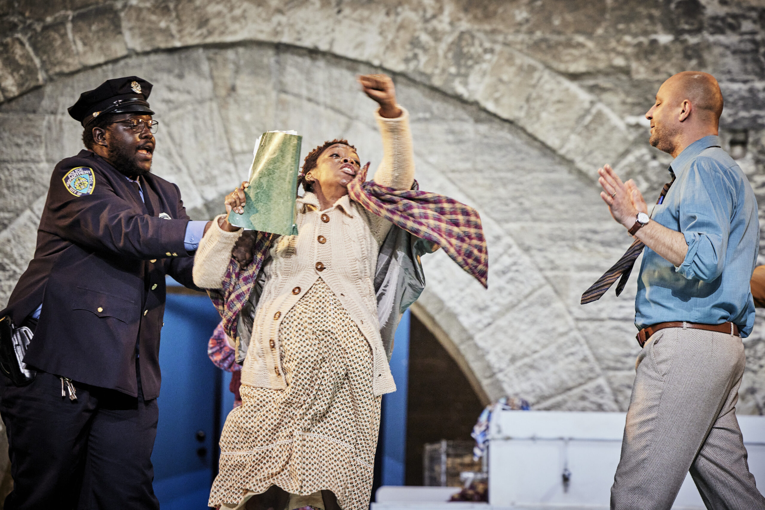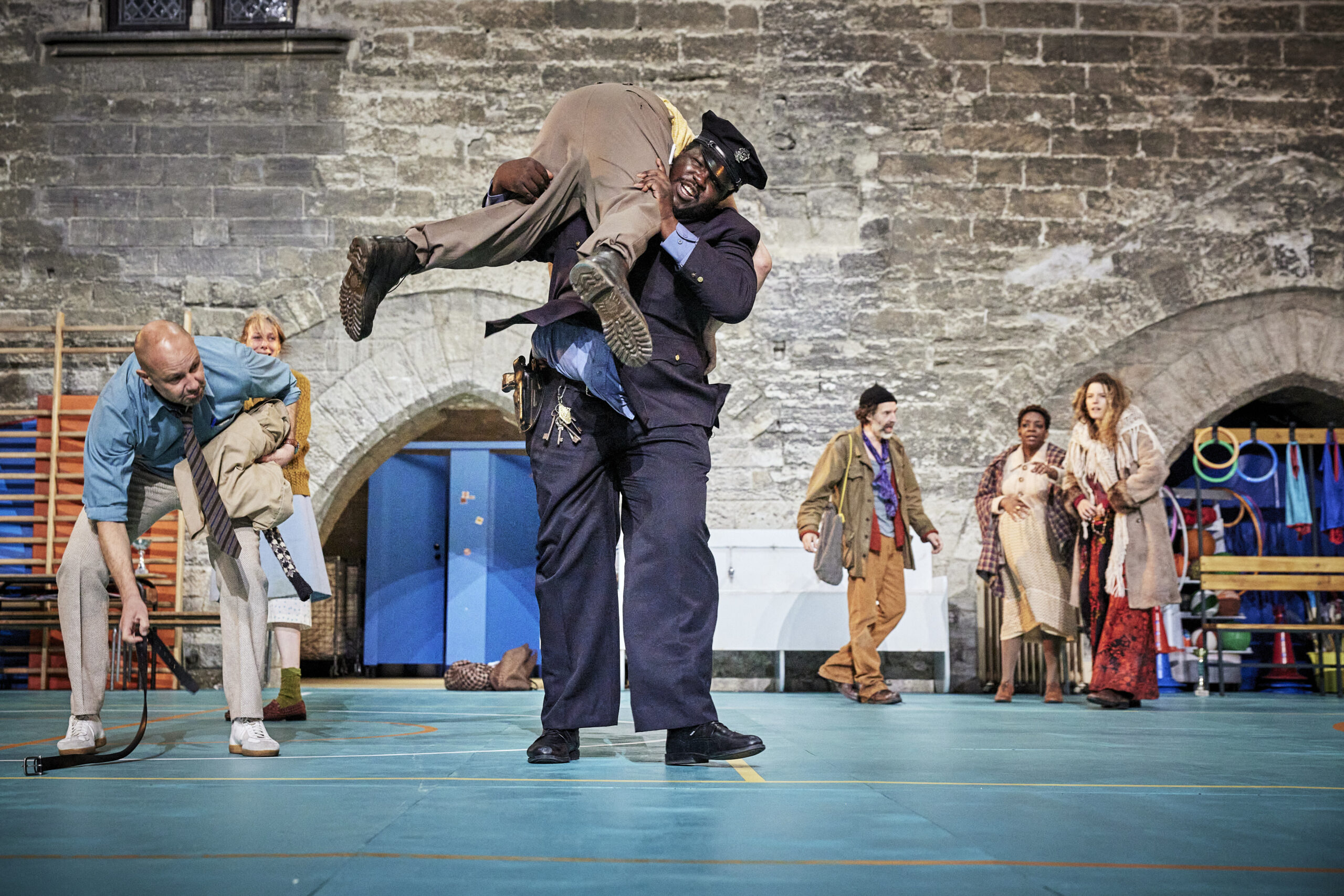 C’est sur une idée de Frederick Wiseman (dont le film est sorti en copie restaurée 4K aujourd’hui) que Julie Deliquet a mobilisé plusieurs plumes pour réaliser une adaptation scénique de Welfare, le neuvième film du réalisateur. Alors que les spectateurs et les officiels – dont la ministre de la Culture – s’installent, les ouvriers sont en place sur la scène transformée en grand terrain d’EPS des années 1970. Ils démontent une série de tentes ou d’urnes pour laisser l’espace vide et libre. C’est au micro qu’une des actrices demande à l’audience une minute de silence en mémoire de Nahel. La pièce commence comme si nous faisions partie des nombreux demandeurs d’aide sociale. Et chaque cas est traité par l’ensemble de l’équipe, un par un, avec des longueurs. Un policier (excellent Salif Cisse) assure que tout se passe en paix. Sauf que cela créé de grandes tensions de bombarder des gens affamés, souvent drogués ou fragiles psychologiquement, et sans toit de demandes de documents et les renvoyer à la sécurité sociale qui les renvoie elle-même à l’aide sociale.