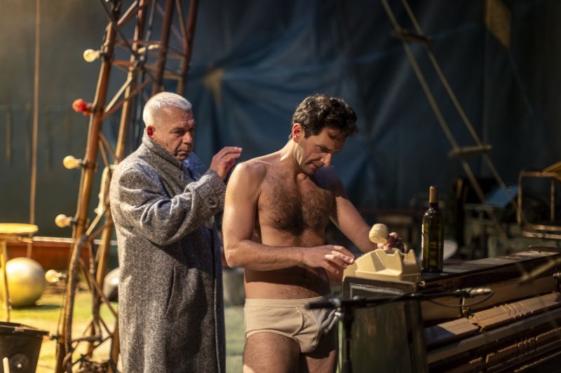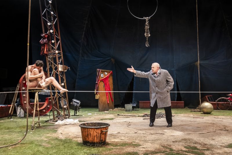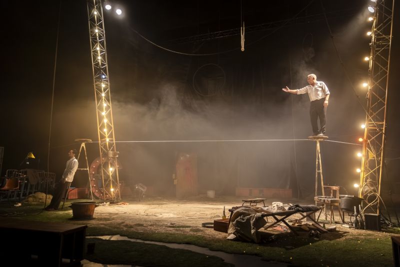 Les mots, la musique et la danse s’entrelacent dans une scénographie de Raymond Sarti, qui nous invite dans un cirque abandonné, redécouvert. Le décor foisonnant et les teintes lumineuses signées Bertrand Couderc installent une ambiance de misère chaleureuse, un chaos réconfortant dans lequel s’illustre des amours exigeants : l’amour d’un être pour un autre, l’amour du funambule pour son fil, l’amour de l’«être» artistique.