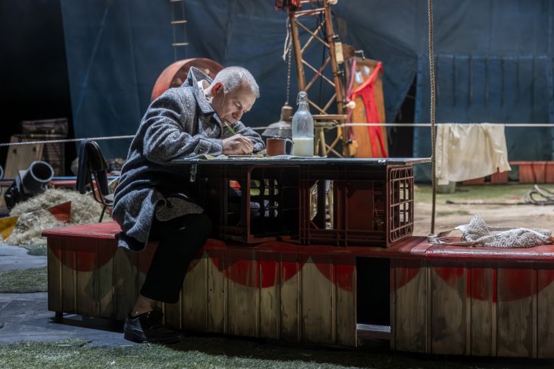 Philippe Torreton a choisi de se mettre dans la peau de l’auteur et de s’adresser à la fois au public, à lui-même, à l’acrobate mais également au musicien.