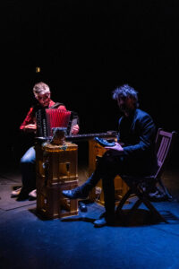 Quand David Murgia est à bout de mots, d’expiration, le souffle ne meurt pas : il s’engouffre dans l’accordéon de Philippe Orivel et raconte encore, entre nostalgie et mélancolie. La musique n’accompagne pas, elle est le souffle, le relais que l’on se passe dans ce marathon de mots, la pause d’oxygène.