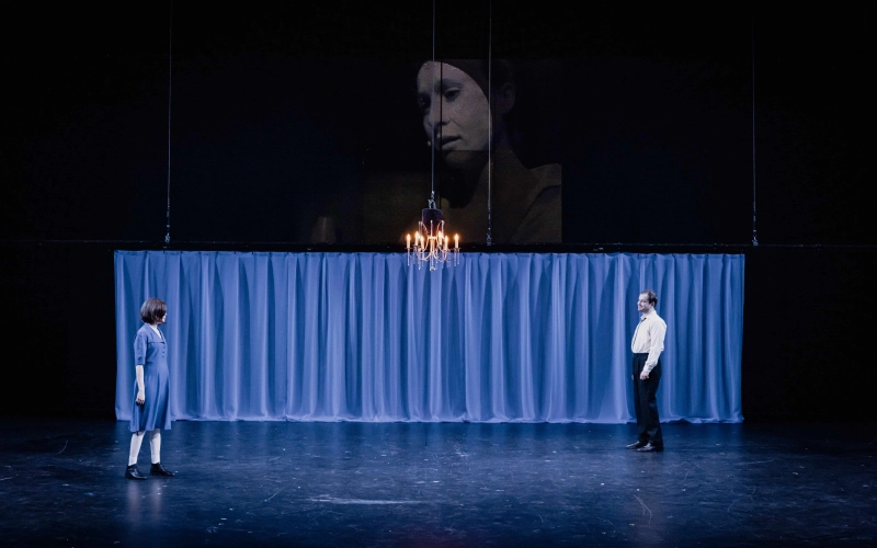 Dès sa jeunesse, la mort rôde autour de Simone. Carré court, une actrice nous fait traverser ses jeunes années. Toute la première partie, nous sommes chez les Beauvoir. Les Beauvoir en réception, les Beauvoir pendant la Première Guerre mondiale, les Beauvoir en pleine séduction, les Beauvoir répondant aux questions de leurs filles. Une deuxième comédienne endosse Simone. Elle est enfant, bébé presque. Le décor est minimaliste ; il s’agit d’un cagibi suspendu en hauteur dans lequel elle est enfermée, punie, et de quelques parois pour former des pièces, comme une maison de poupée. Simone est une poupée hors sol, hors de son monde, déjà. Une forme d’austérité règne, d’étrangeté, d’anormal. Le tout est porté par une logistique scénique apparente. Des masques d’âne et de bœuf font de Simone une messie, enfant prodige. Une caméra se déplace et montre, en fond de scène, les visages en gros plans et les hors champs à la façon de Julien Gosselin. Tout ancre la fabrication d’une personnalité hors normes, dès l’enfance.