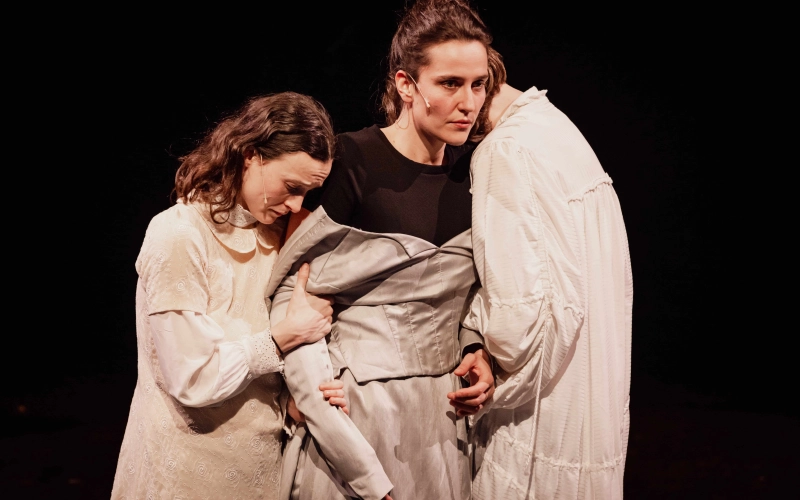 Voici la première force de la proposition, la mise en corps de l’enfant Beauvoir, ou plutôt d’une enfant Beauvoir à partir de ce que le collectif a tiré de ses recherches. Elle parait agitée, muée par une forme de folie d’esprit. Elle a 7 ans, elle est « terriblement pieuse », « terriblement chauvine », on la sent simplement terrible. Une troisième comédienne prend le costume : elle est jeune adolescente, elle est déchainée, travaillée par la sexualité, la poussée du corps, les livres interdits. Elle a quelque chose de trivial. Elle est vagabonde, mais elle ne le sait pas encore. Pour l’heure, Simone dit qu’elle ne se mariera jamais (soit !) parce qu’elle aime trop ses parents, elle préfère entrer au couvent ! La petite fille rangée est encore loin d’elle-même, se dit-on.